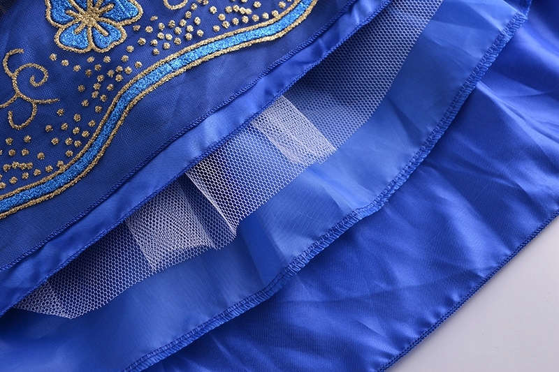 - Sukienka jest utrzymana w przepięknych odcieniach błękitu, połączonych z eleganckim różem oraz efektownymi złotymi wzorami.