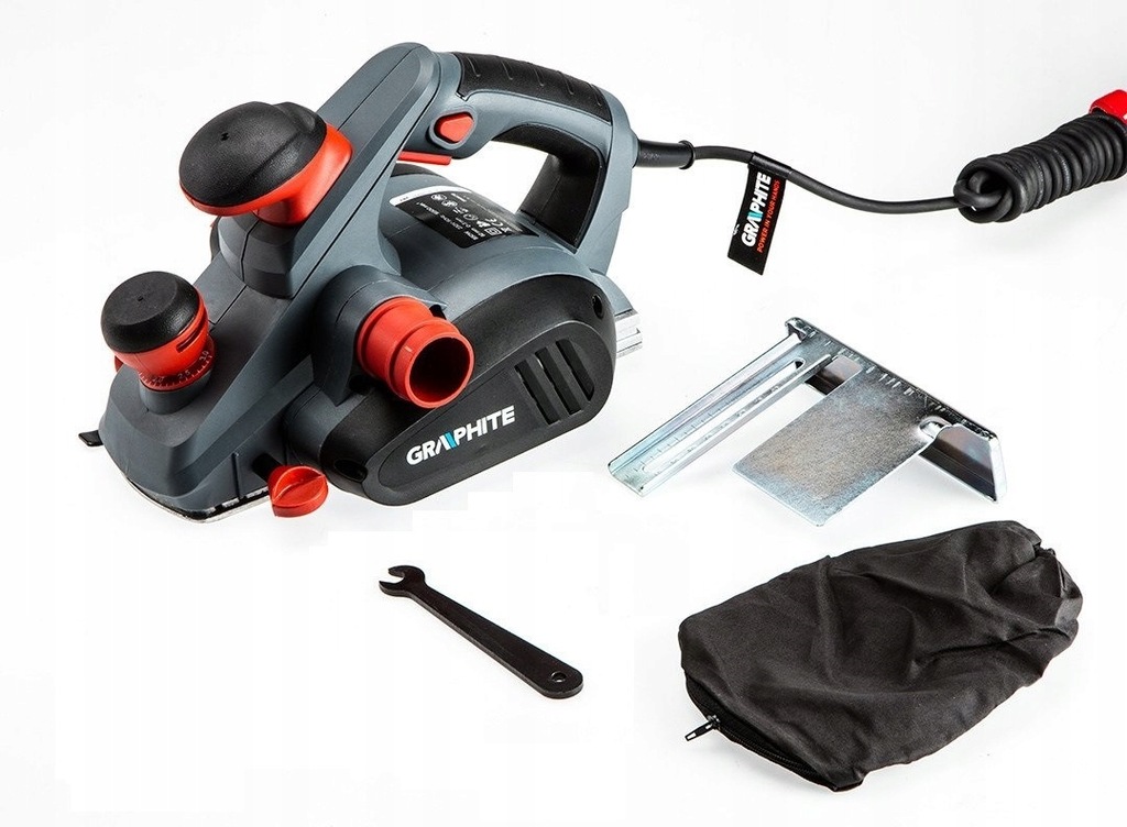 W zestawie ze strugiem znajdują się: worek na pył, prowadnica równoległa oraz wspornik i prowadnica do strugania wgłębnego.