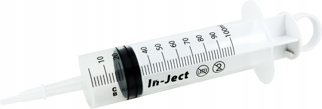 W zestawie znajduje się strzykawka 100 ml, jak na ostatnim załączonym zdjęciu (bywa różnych producentów, ale taka sama, wysoka półka jakościowa).