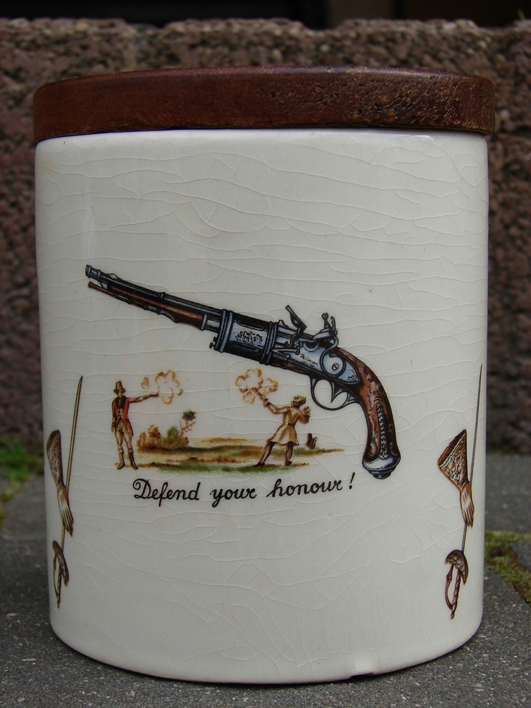 Stylowy ceramiczny pojemnik na tytoń dekorowany sceną rodzajową.