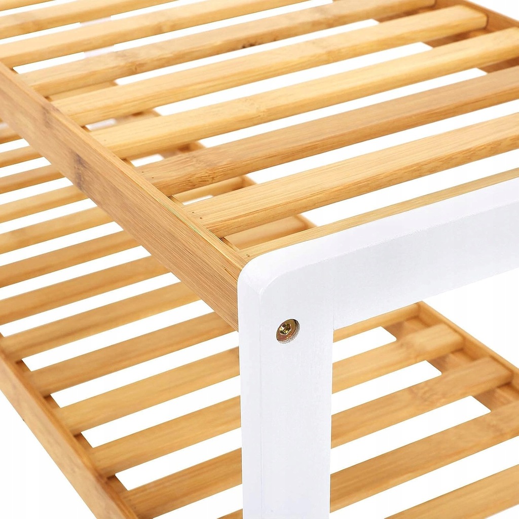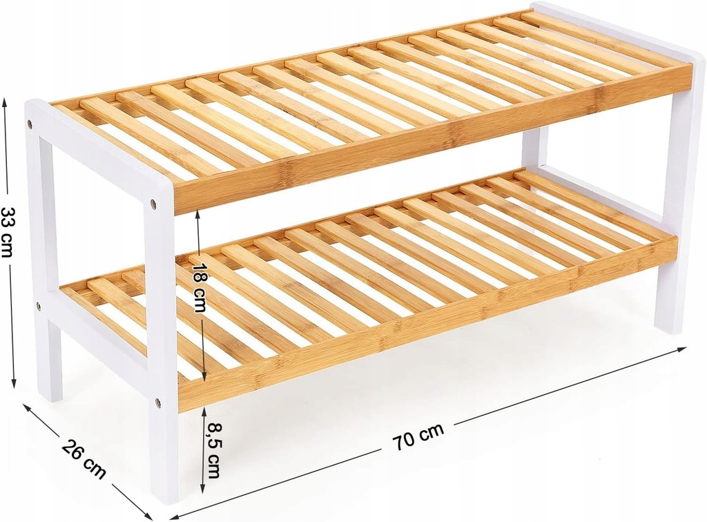 - Co otrzymasz: Regał na buty z bambusa, który jest wyposażony w 2 półki. Pozwól sobie na ten regał i przechowuj swoje buty w uporządkowany sposób – przyjmij gości w uporządkowanym korytarzu!