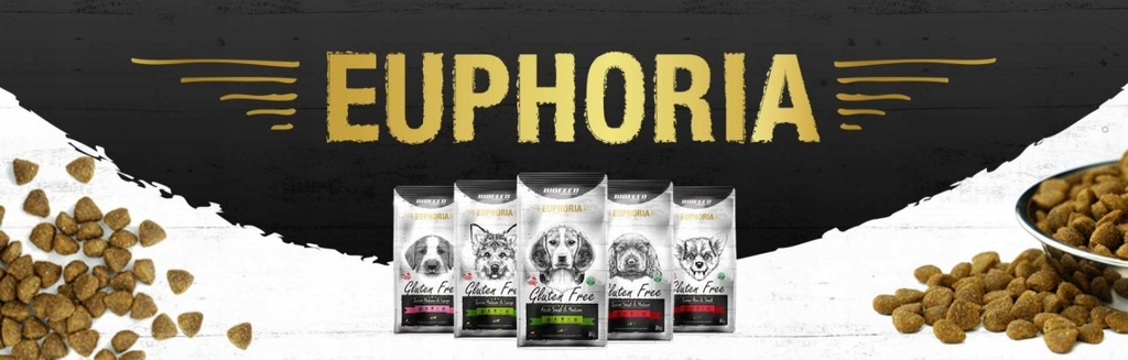 - Wysoka smakowitość - dzięki dużej zawartości mięsa psy chętnie wybierają karmę Euphoria.