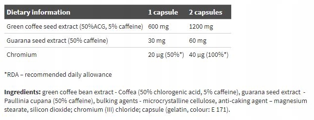 - ekstraktu z nasion zielonej kawy (1200 mg - 2 kapsułki), standaryzowanego na zawartość 50% kwasu chlorogenowego (ACG) - kawa stymuluje aktywność fizyczną i umysłową