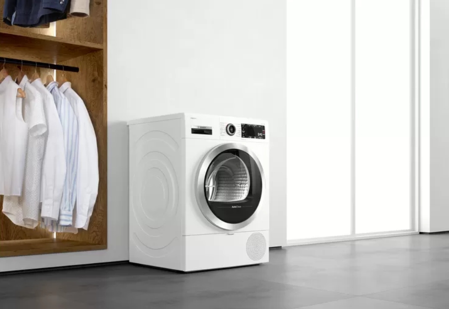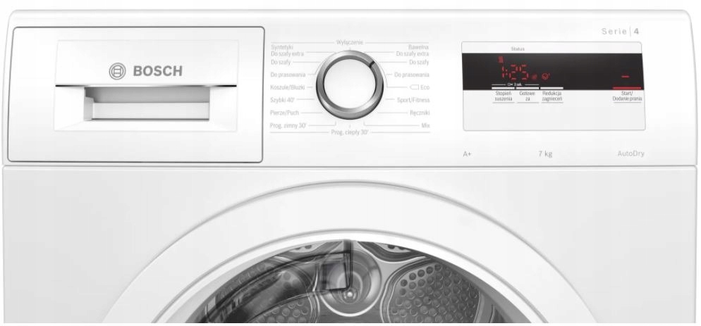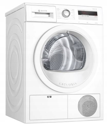 Suszarka kondensacyjna z pompą ciepła BOSCH WTH850F7PL o maksymalnym załadunku 7 kg, sterowanie elektroniczne z wyświetlaczem LED oraz czujnikiem wilgotności powietrza, technologia AutoDry, Sensitive Drying System oraz AntiVibration Design, wygodny w czyszczeniu filtr wymiennika ciepła, klasa energetyczna A+.