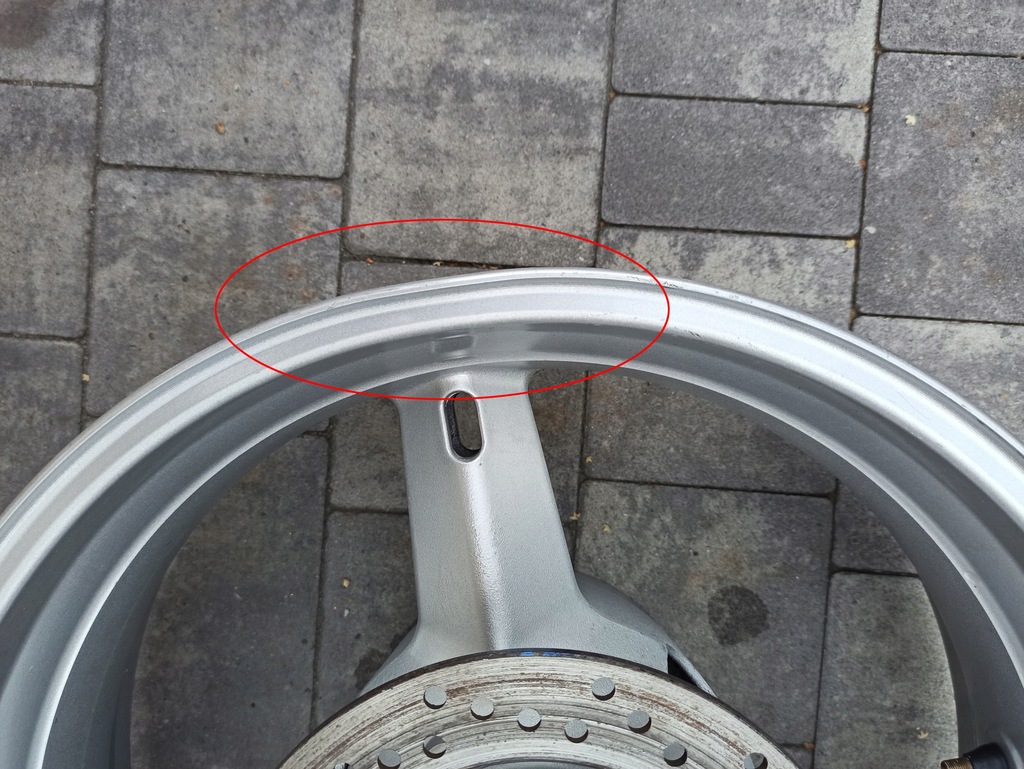 Felga tylna do Suzuki SV1000 z lat 2003-2007. Felga wizualnie w bardzo dobrym stanie, lakier nie zniszczony, w komplecie z tarczą również w bdb stanie bez wyraźnego rantu. Felga posiada delikatne skrzywienie na rancie z jednej strony (zaznaczone na zdjęciu). Jest to skrzywienie w linii pionowej więc bardzo łatwe do wyprostowania bez konieczności lakierowania. Brak skrzywień/bicia w osi poziomej.