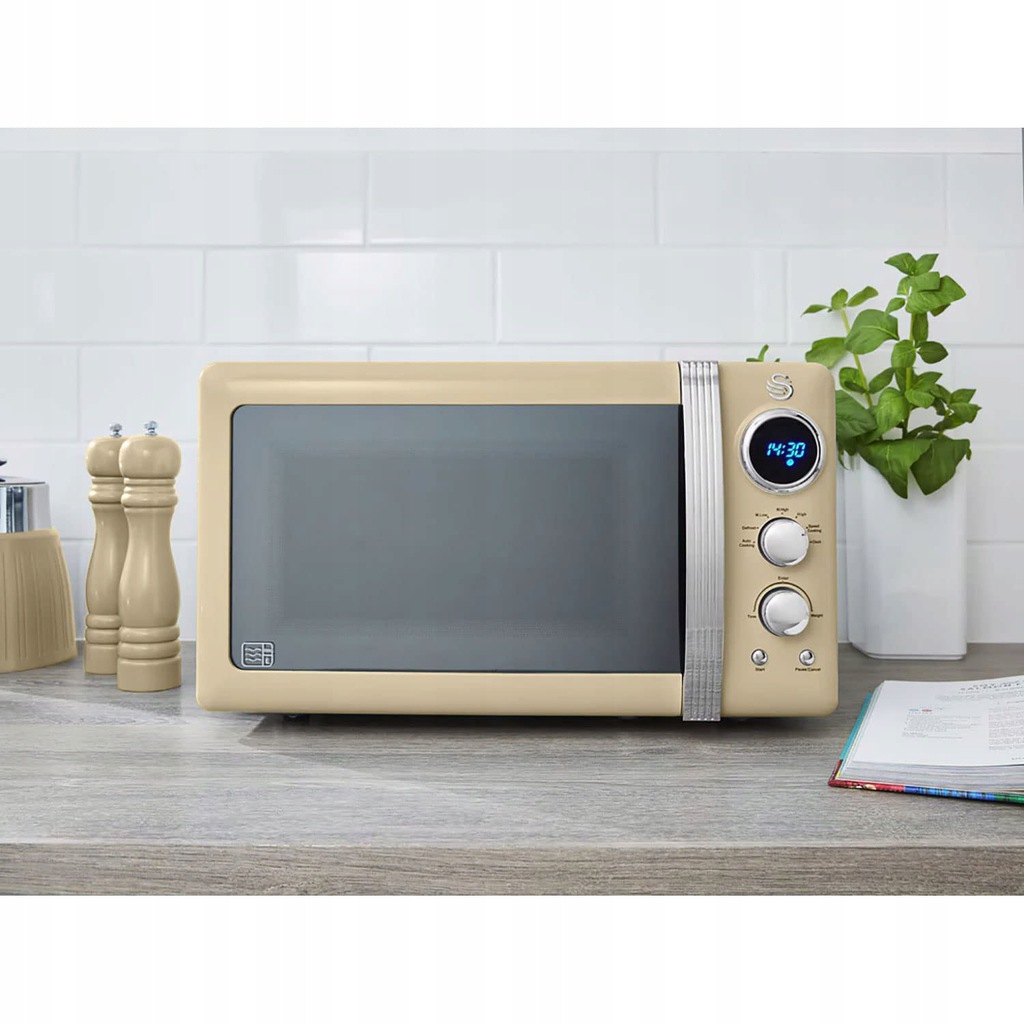 Swan Retro Set Śniadanie Czajnik na wodę 1,8 l, Toster Pan Szeroki Gniazdo 2 Plastry, Mikrofalówka Cyfrowy 20L, 6 poziomów mocy, Timer, Lustrzane drzwi, Wzór Vintage, Krem, Jeden rozmiar