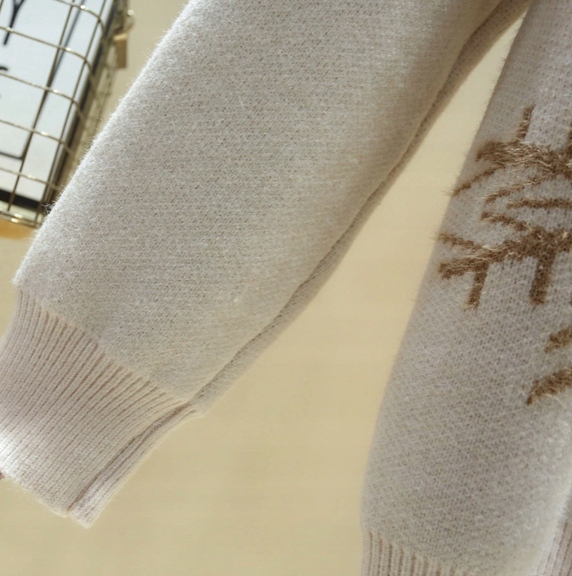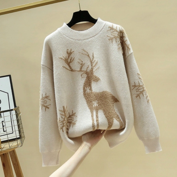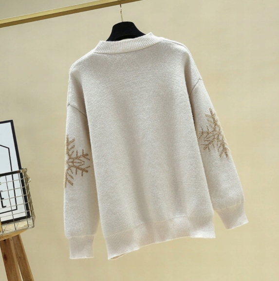 Uroczy, gruby sweter damski z ozdobnym reniferem i śnieżynkami.