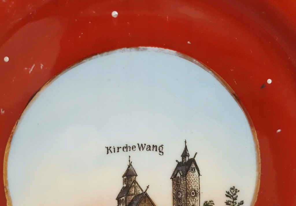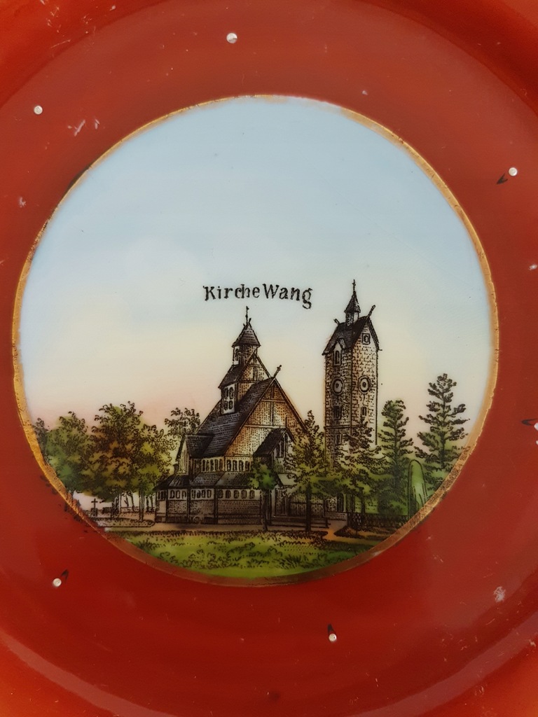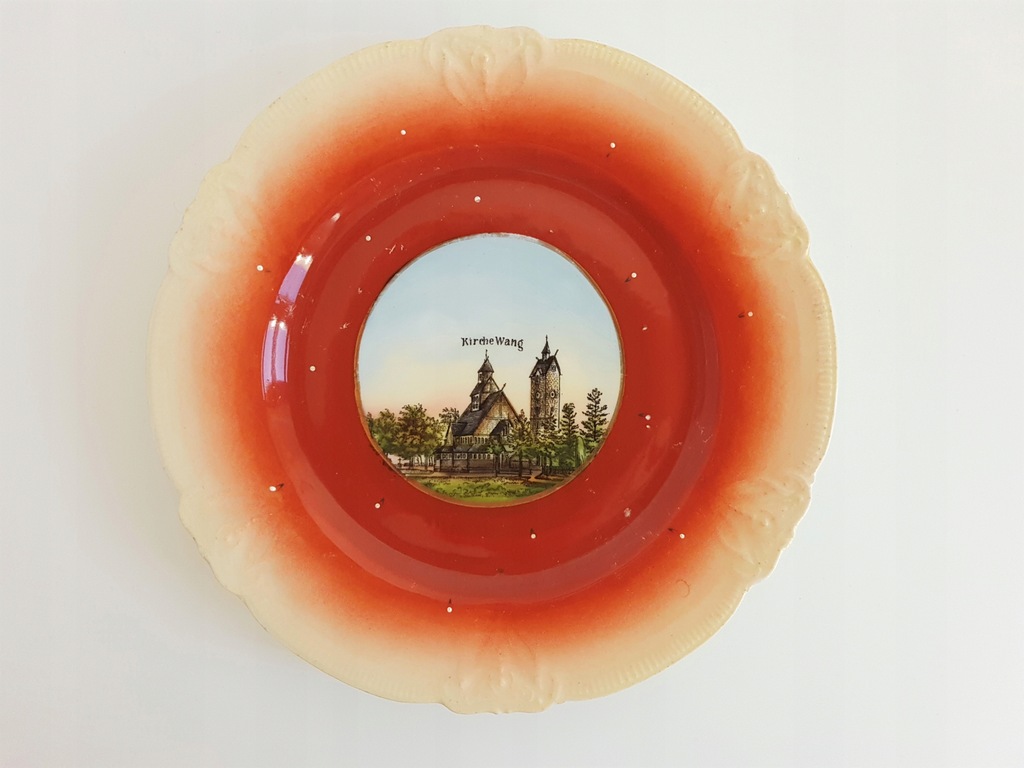 Talerz z truskawkowym dekorem - stara, przedwojenna pamiątka z wizerunkiem Świątyni Wang w Karpaczu (napis w języku niemieckim "Kirche Wang").