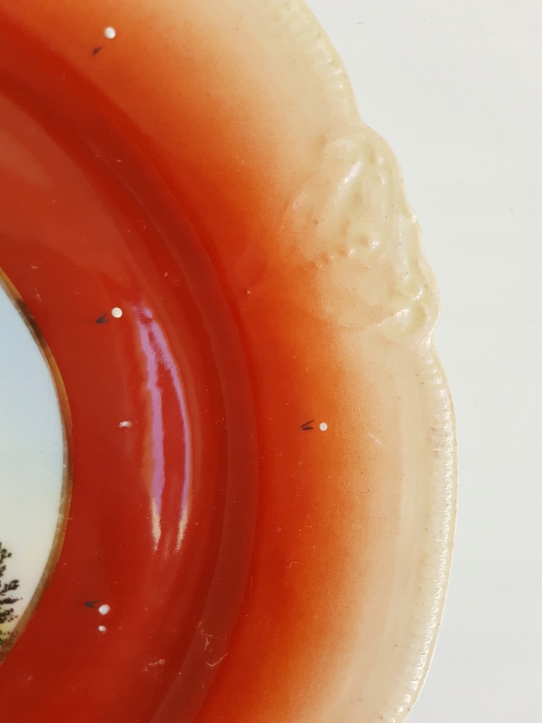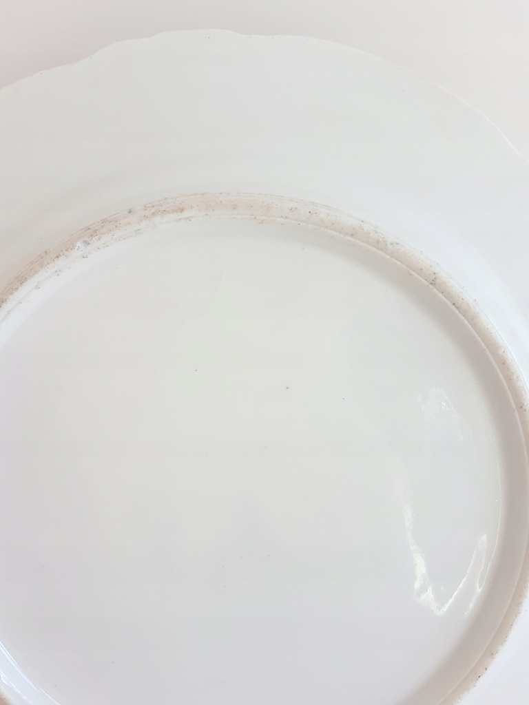 Stan: ładnie utrzymany, bez większych przetarć, ale z jednym pajączkowym pęknięciem (ciężko ująć go niestety na zdjęciach). Cienkościenna, delikatna porcelana.