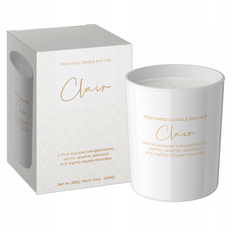 Clair for Her. Celebracja kobiecości. Siła, delikatność, czystość uczuć i magia uwodzenia. To wielowymiarowy, doskonale skomponowany bukiet świeżych kwiatów pomarańczy, jaśminu i irysów. Przenika się z aromatami słodkiego karmelu, wanilii, urzekającej paczuli i lekko szyprowej czekolady. Zmysłowy zapach świecy uwiedzie swoim czarem.