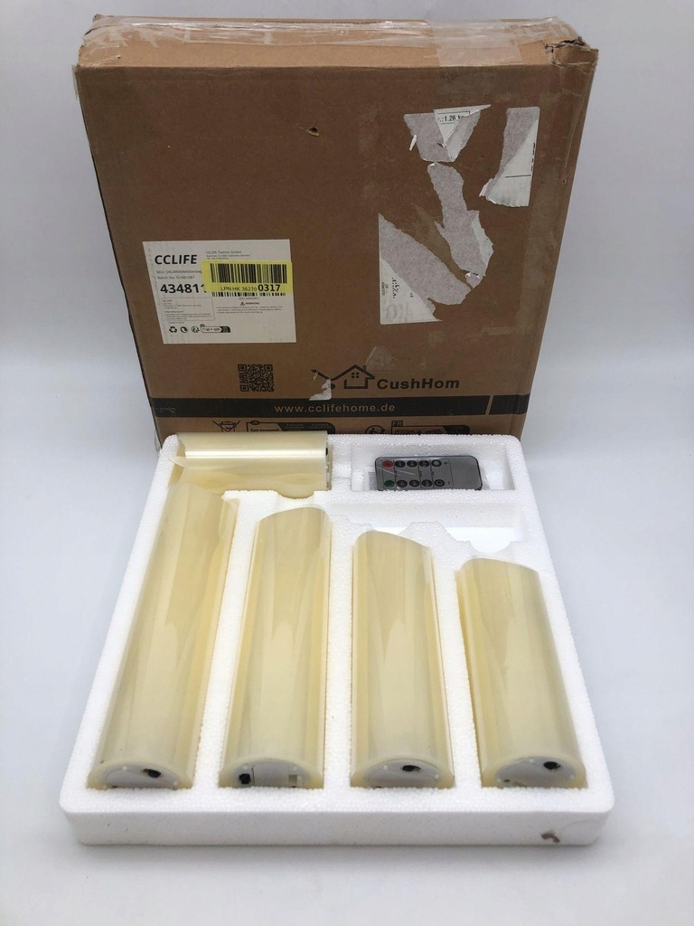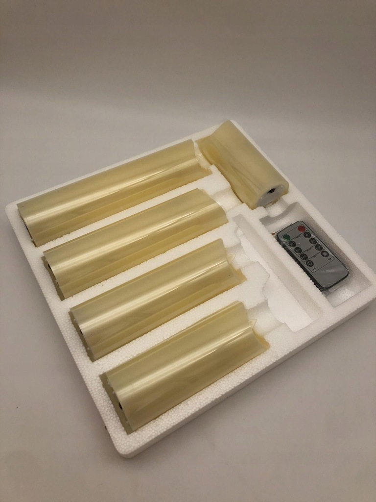 Zestaw 5 świec LED: - średnica 5,5cm. Każda o wysokości 12,5 cm / 15 cm / 17,5 cm / 20 cm / 22,5 cm + 1 pilot (w tym 1 bateria guzikowa) + 1 instrukcja obsługi. (Każda świeca wymaga 2 baterii AA, które nie są dołączone!!!)