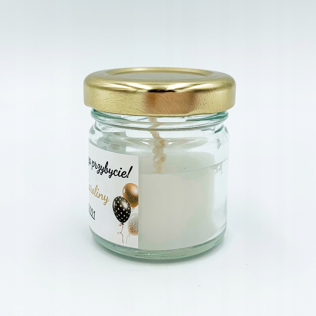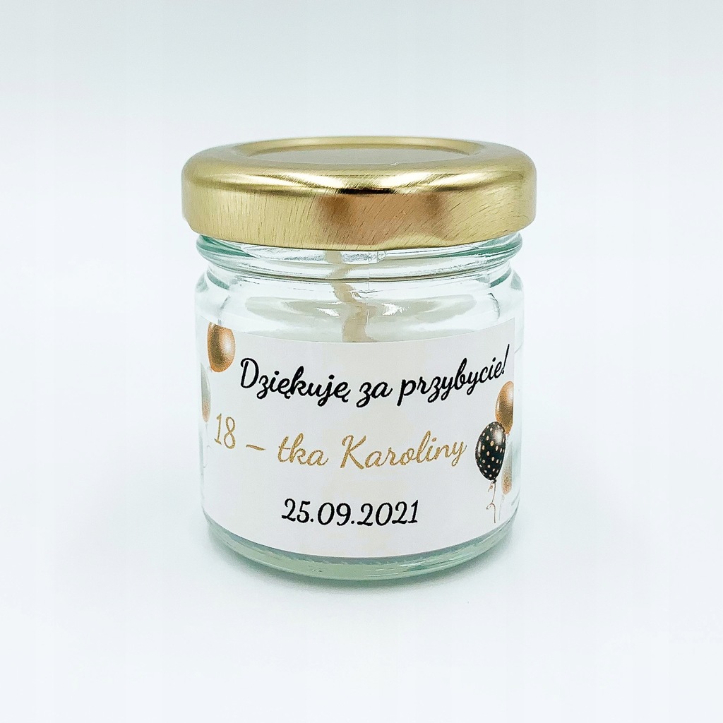 Na słoiczku naklejona jest etykieta z napisem "Dziękuję za przybycie!" wraz z wiekiem, imieniem solenizanta oraz datą. Na etykiecie znajduje się ozdobna grafika.