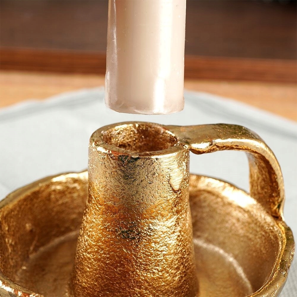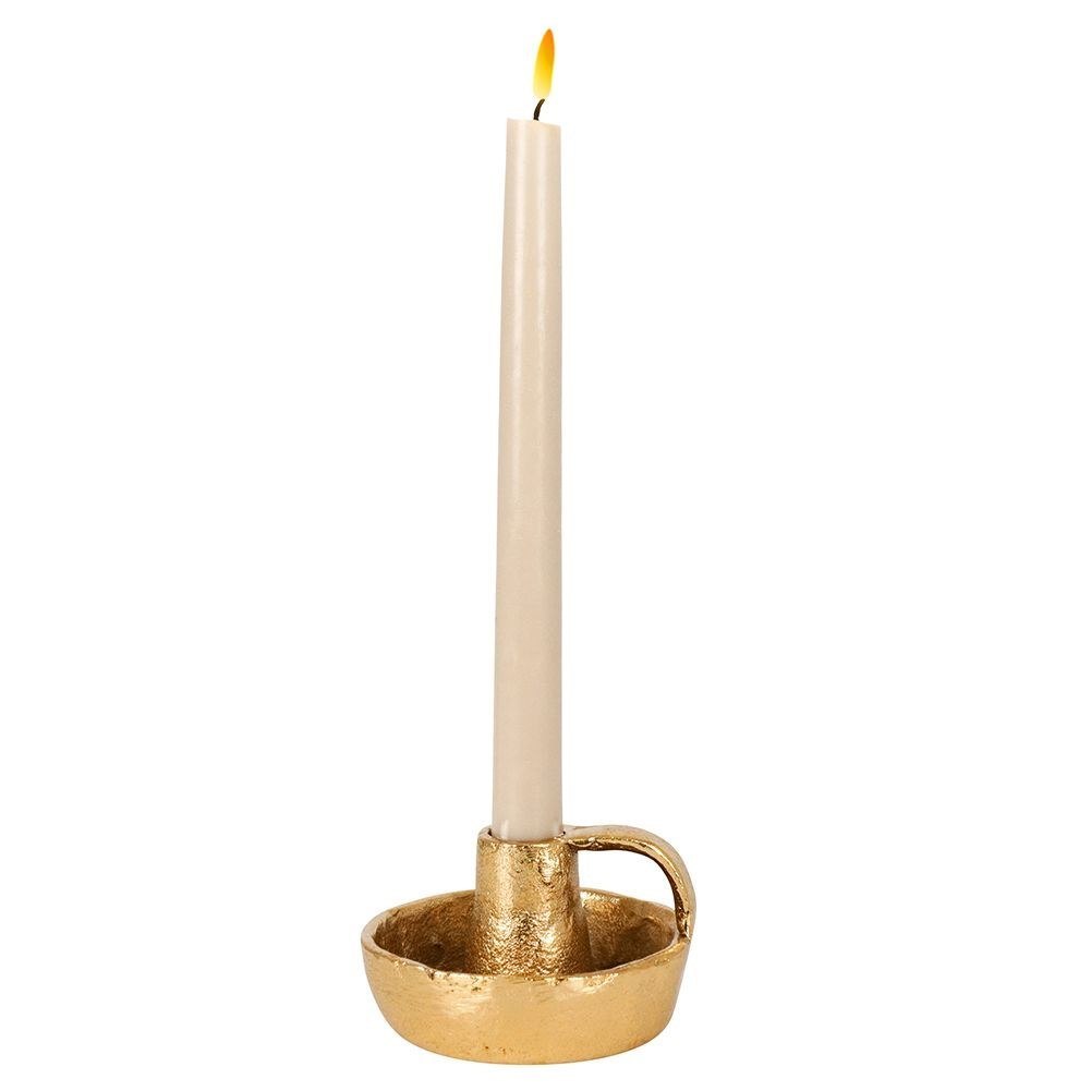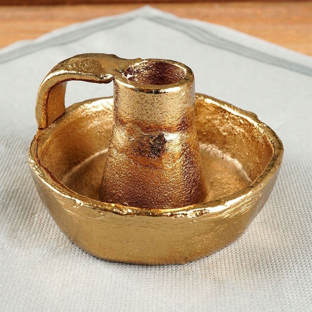 - SOLIDNY - Wykonany z najwyższej jakości aluminium w złotym kolorze. Świecznik posiada okrągłą podstawę, która zapewni stabilność. Dodatkowo posiada wygodny uchwyt ułatwiający przenoszenie.