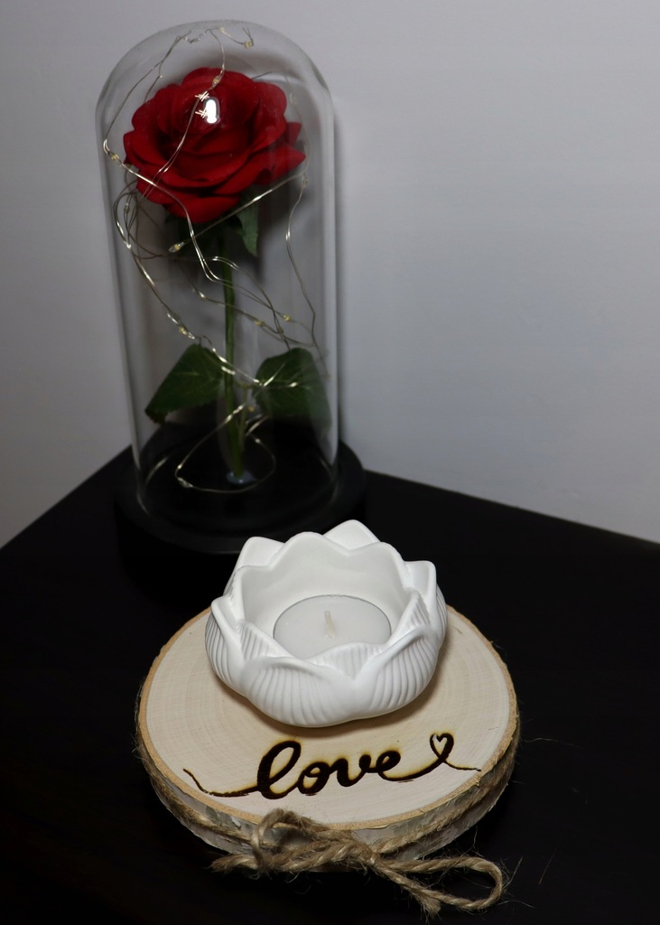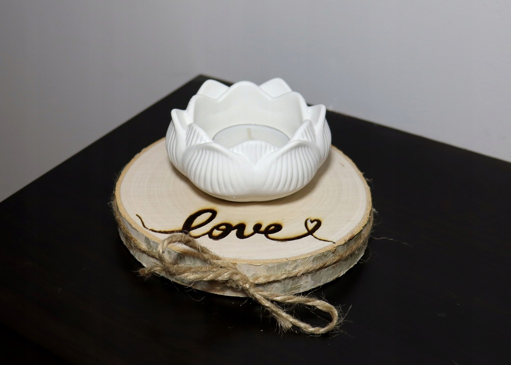 Ręcznie wykonane świeczniki z ceramiki gipsowej na plastrze drewna z grawerem love, świetnie nadają się do ozdoby półek, stolików, czy regałów.