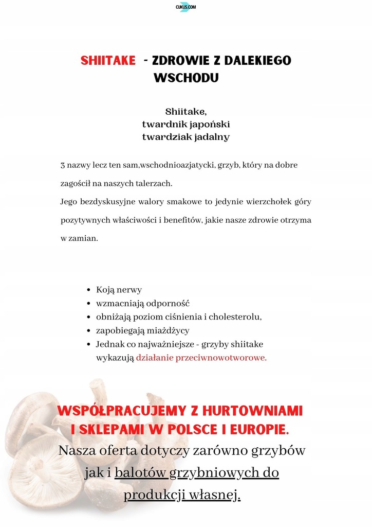 Zapraszamy do zainteresowania się naszym wjątkowym produktem jakim są GRZYBY SHIITAKE. Na tej aukcji zakupią Państwo świeże, nad wyraz zdrowe grzyby, pochodzące z naszej polskiej, ekologicznej uprawy. Cena dotyczy 1 kg (1szt = 1kg)