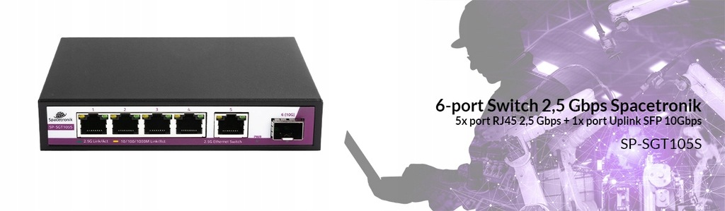 Switch Spacetronik z portami RJ45 2,5G oraz portem SPF+. Automatyczna negocjacja portów, wskaźniki LED do monitorowania stanu oraz prosty montaż plug and play bez konfiguracji urządzenia. Idealny do większości zastosowań.