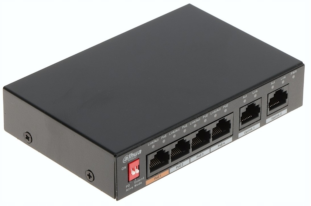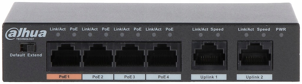 Dahua PFS3006-4ET-60-V2 - to niezarządzalny przemysłowy switch PoE z budżetem mocy 60W posiadający 4 portów PoE 10/100 Mbps oraz dwa 2 porty Uplink 10/100 Mbps. Szczególnie polecany do budowy systemów monitoringu w trudnych warunkach środowiskowych.
