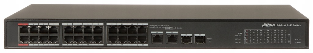 Porty LAN: 24 x RJ45 10/100 Base-T ( 2 x Hi-PoE (802.3bt) + 22 x PoE (802.3af/at) ), 2 x port Combo: SFP (1000 Base-X) / RJ45 (10/100/1000 Base-T) - Uplink ; Szybkość transmisji: 10 / 100 Mb/s : 24 Porty LAN & PoE, 10 / 100 / 1000 : 2 Porty RJ45 (Uplink), 1000 : 2 Porty SFP (Uplink) ; Maksymalna sumaryczna moc: 360 W ; Wybrane cechy: Switch jest zarządzalny poprzez www oraz przez chmurę (aplikacja DoLynk Care) ;