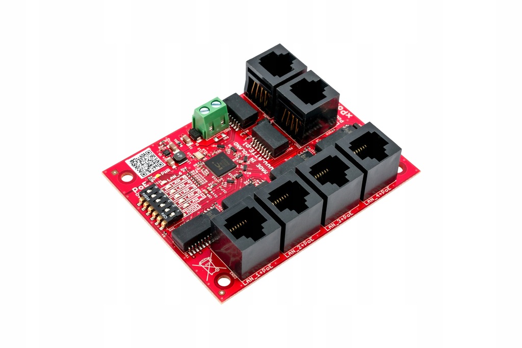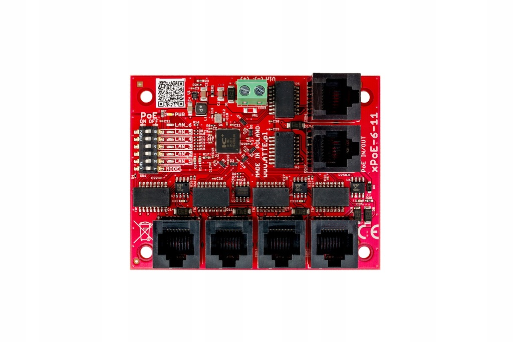 - Mikroprzełączniki SW1 przełącznik 1 "MODE" - tryb pracy switcha przełączniki 2...6 "PoE ON/OFF" - zasilanie PoE na portach LAN_1...LAN_5