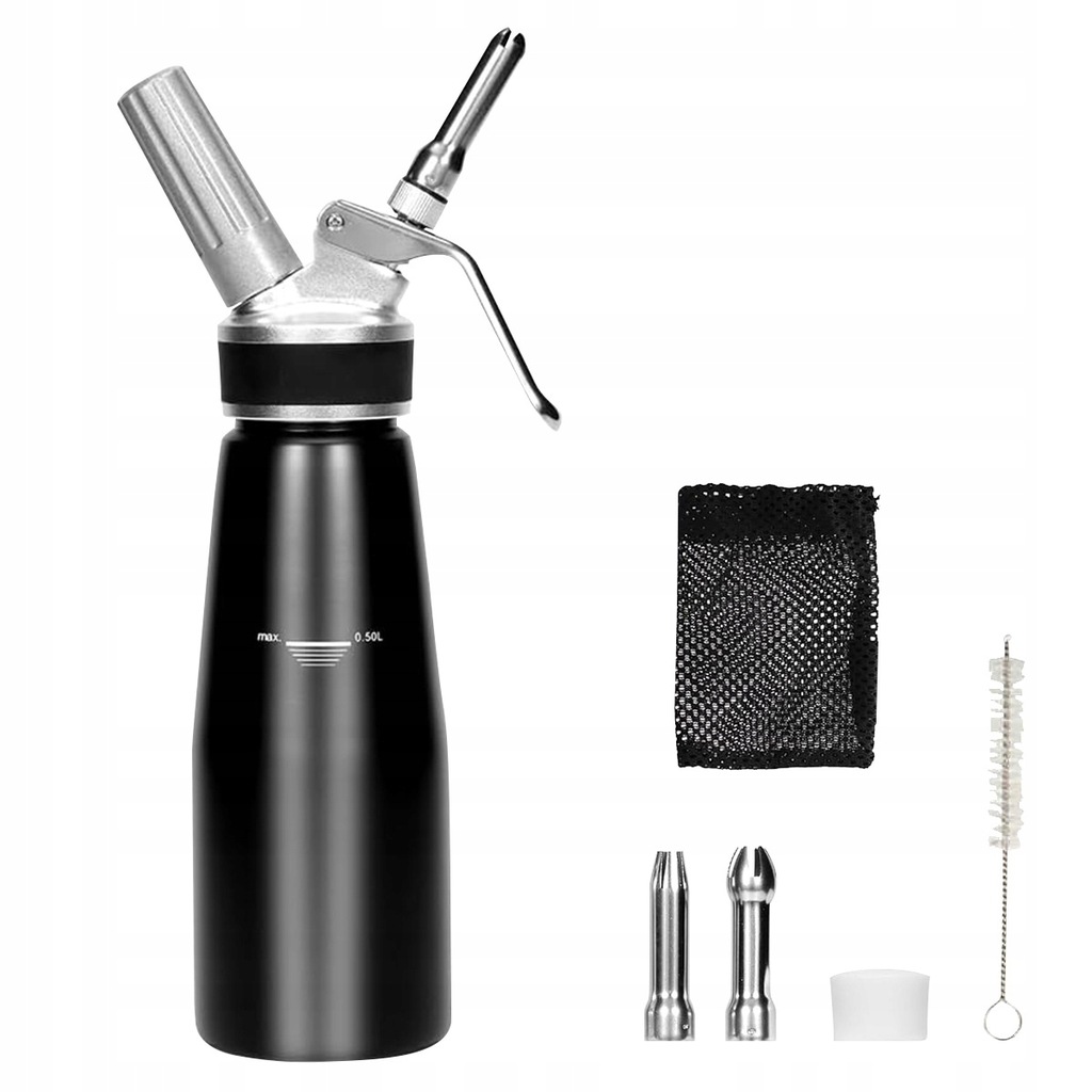 Dozownik do śmietany 500 ml, wysokiej jakości aluminiowy syfon do śmietany z 3 dyszami ze stali nierdzewnej i uchwytem na kapsułki do śmietany, espumy, zimnych i ciepłych sosów (czarny)