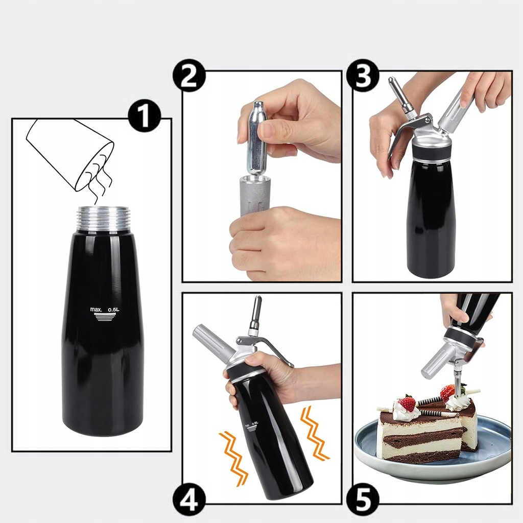 🍰 Pyszności: za pomocą syfonu do śmietany w mgnieniu oka przygotujesz śmietanę, kremy lub desery, dzięki czemu udoskonalisz ciasto i inne desery. Jednocześnie syfon do bitej śmietany pozwala utrzymać świeżość śmietany w lodówce do tygodnia.