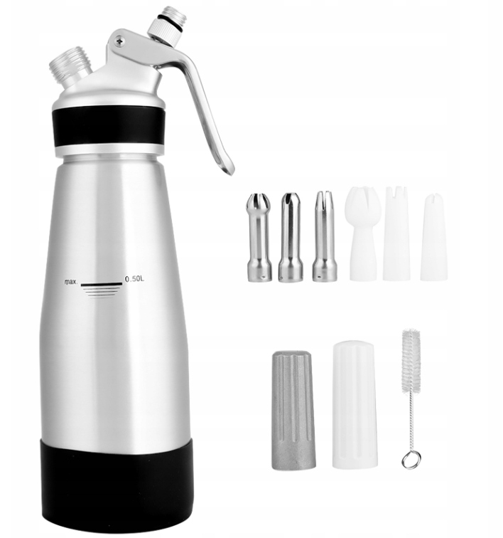 6. Głowica spieniacza skierowana w dół, usta h w stronę pojemnika, dokręcić kluczem do spieniania i krem jest rozpylany wewnątrz spieniacza.