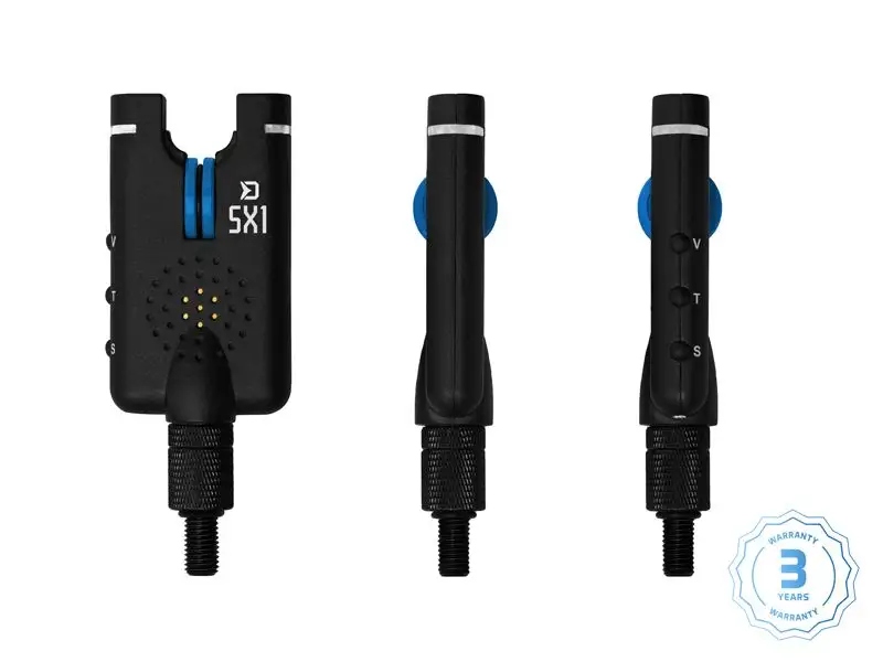 Sygnalizator elektroniczny włącza się poprzez przytrzymanie przycisku V znajdującego się z boku. Posiada 5 różnych poziomów głośności, w tym tryb cichy, w którym branie sygnalizowane jest wyłącznie światłem. Możliwy jest również wybór jednego z czterech tonów (przycisk T) i czterech poziomów czułości (przycisk S) według potrzeb. Sygnalizator zachowuje wybrane ustawienia w pamięci i nie musi być ustawiany wielokrotnie po każdym włączeniu. Kolorowa dioda LED zaświeci się, aby ostrzec Cię o braniu i będzie migać przez następne 15 sekund po braniu. Sygnalizator posiada również umieszczone diody nocne, antypoślizgowe łoże lub wejście 2,5 mm. Zasilanie zapewnia akumulator 1xA23 12V, który pomimo swoich minimalistycznych wymiarów charakteryzuje się doskonałą trwałością. Krótki sygnał dźwiękowy zaalarmuje Cię, gdy pojemność baterii zbliża się do końca.