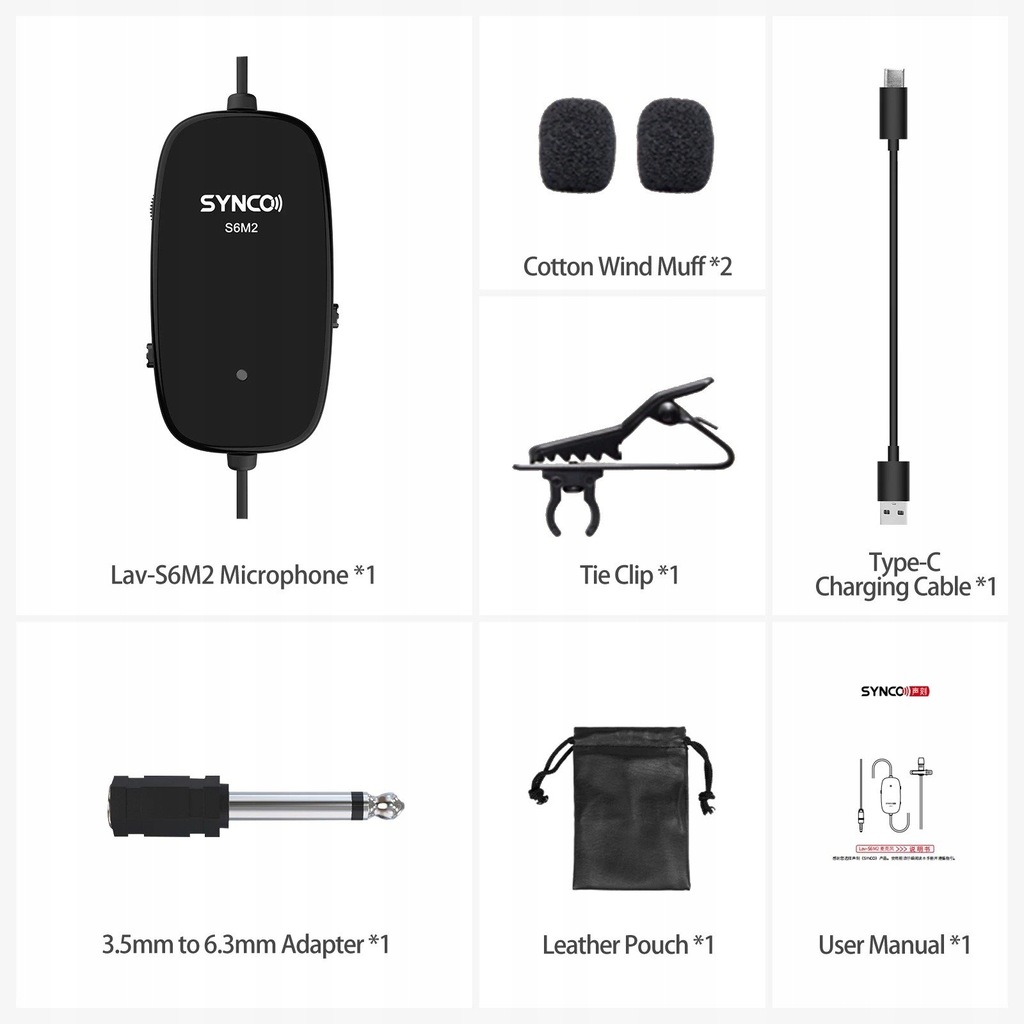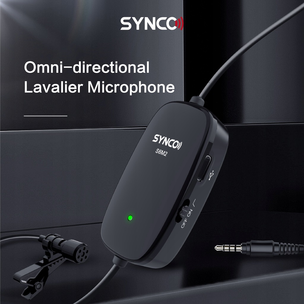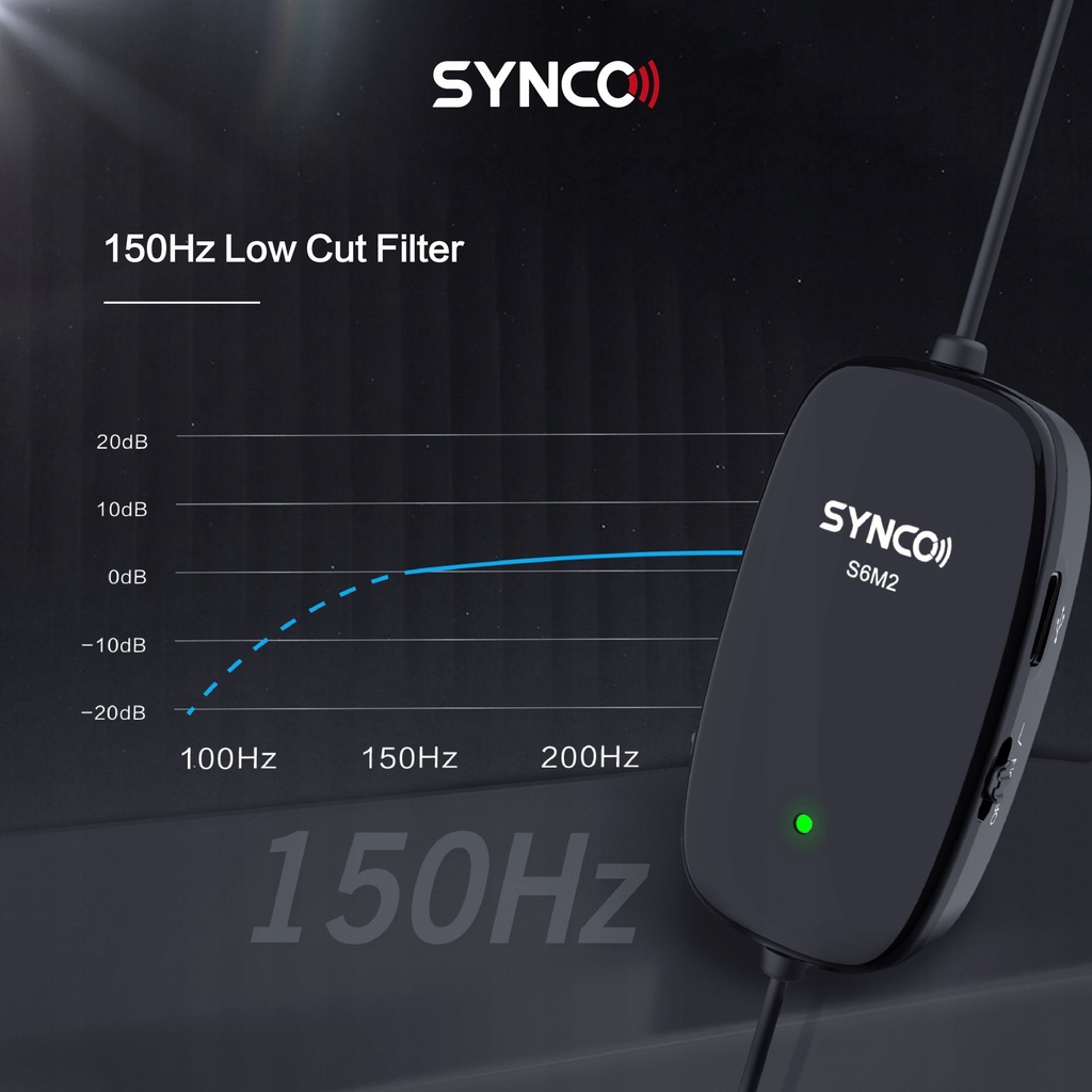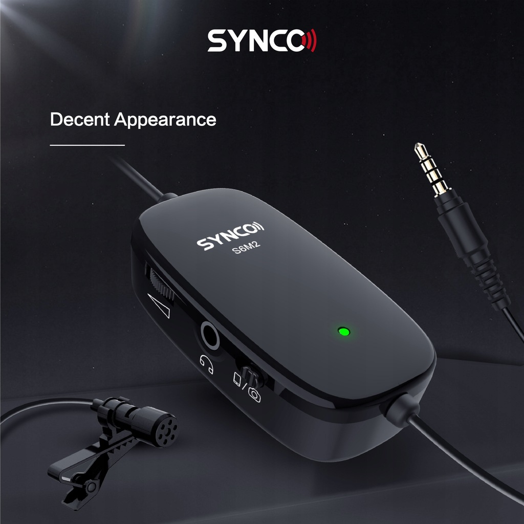 SYNCO S6M2 jest nowoczesnym, pojemnościowym mikrofonem typu lavalier. Został wyposażony w technologię cyfrowego przetwarzania sygnałów opartą na matematycznych modelach analizy dźwięku dzięki któremu, sygnał audio jest wzmacniany, a szumy pochodzące z otoczenia redukowane w czasie rzeczywistym. Ten niewielkich rozmiarów mikrofon krawatowy wyposażony jest również w gniazdo słuchawkowe umożliwiające bezpośrednie prowadzenie monitorowania sygnału w czasie rzeczywistym, filtr górnoprzepustowy i regulację wzmocnienia sygnału. Dzięki tym funkcjom można natychmiast reagować na skomplikowane warunki otoczenia aby uzyskać doskonałe wyniki nagrywania i nieprzeciętną jakość zapisu, wyróżniającą ten przewodowy mikrofon na tle innych mikrofonów dostępnych na rynku.