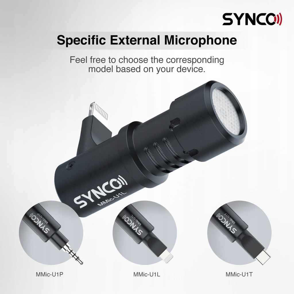 SYNCO U1 występuje w trzech wersjach, które różnią się typem złącza. SYNCO U1P, to mikrofon zewnętrzny do urządzeń ze złączem TRRS 3,5 mm. SYNCO U1L to mikrofon ze złączem iPhone Lightning do iPhone’ów i podobnych urządzeń mobilnych Apple. SYNCO U1T to mikrofon dedykowany do telefonów z systemem Android oraz innych urządzeń ze złączem USB Type-C. SYNCO U1 nie wymaga żadnych przejściówek, dzięki czemu jakości dźwięku nie ulega pogorszeniu.