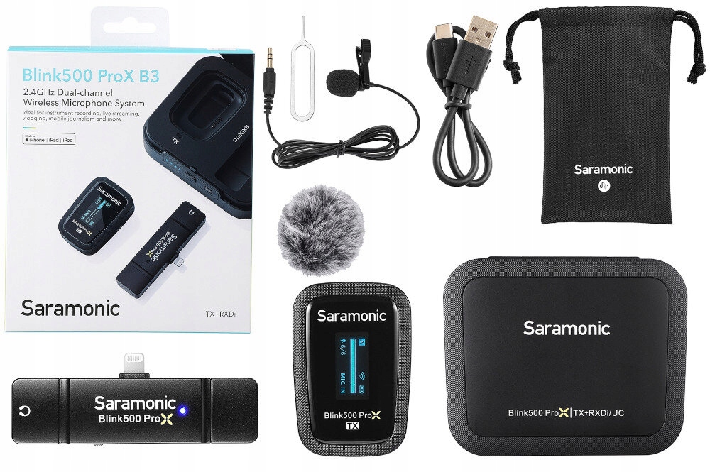 System Saramonic Blink500 ProX B3 (RXDi + TX) to zestaw do bezprzewodowej transmisji dźwięku, który składa się z nadajnika z wbudowanym mikrofonem i odbiornika oraz licznych akcesoriów. Doskonale sprawdza się podczas wywiadów, transmisji live, wideokonferencji. Pozwala nagrywać czysty i wyraźny dźwięk w trybie STEREO i MONO. Jego główne zalety to stosunek sygnału do szumu wynoszący 84 dB, próbkowanie na poziomie 48 kHz, pasmo przenoszenia od 20 Hz do 20 kHz oraz 6 poziomów wzmocnienia sygnału. Odbiornik bezpośrednio połączysz do portu Lightning w smartfonie czy tablecie marki Apple.