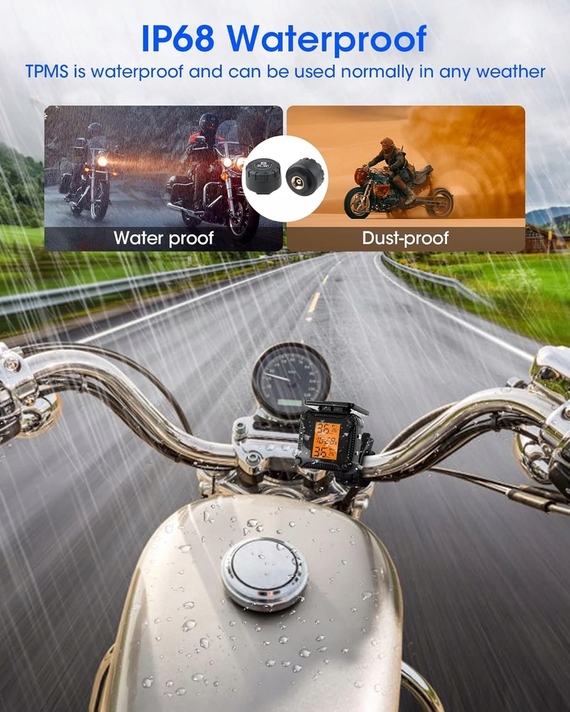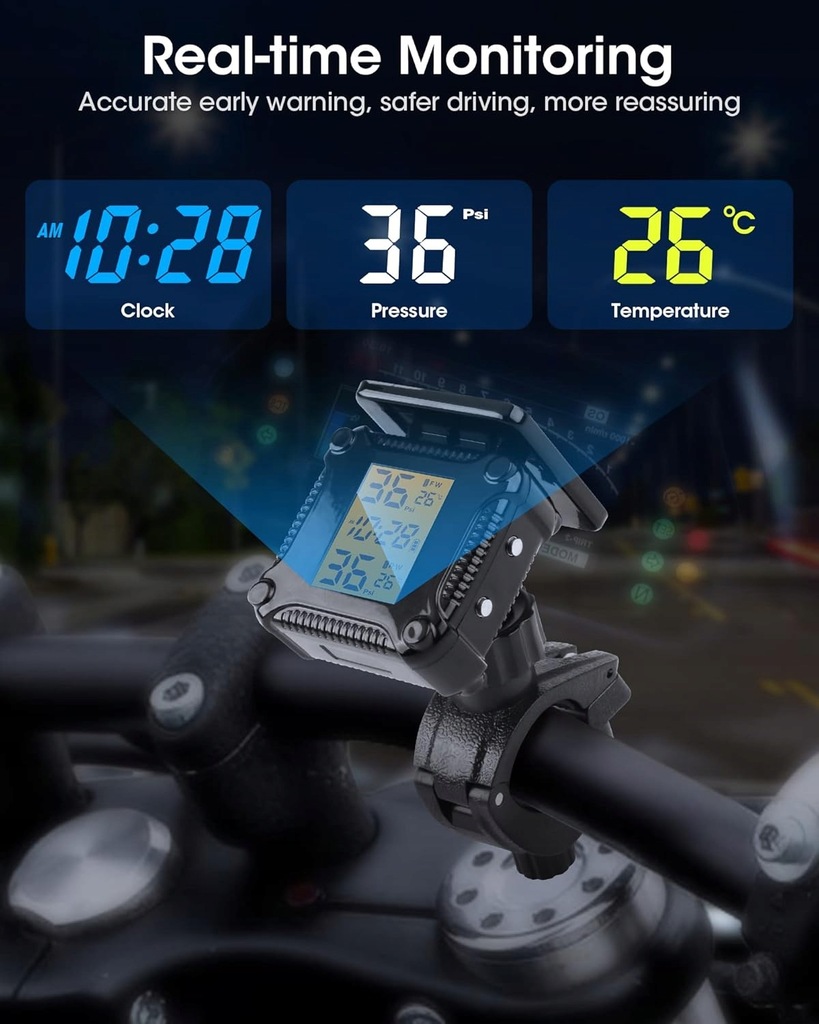 ⋆ Monitorowanie w czasie rzeczywistym i wysoka dokładność: System kontroli ciśnienia w oponach motocyklowych TPMS monitorowanie temperatury i ciśnienia w czasie rzeczywistym z wysoką dokładnością i silnym wnioskowaniem. Specjalnie do stosowania opon motocyklowych z 2 czujnikami. Monitorowanie ciśnienia w oponach, temperatury i czasu w czasie rzeczywistym. W razie potrzeby można przełączać dwie jednostki ciśnienia "PSI, BAR" i dwie jednostki temperatury " , ".