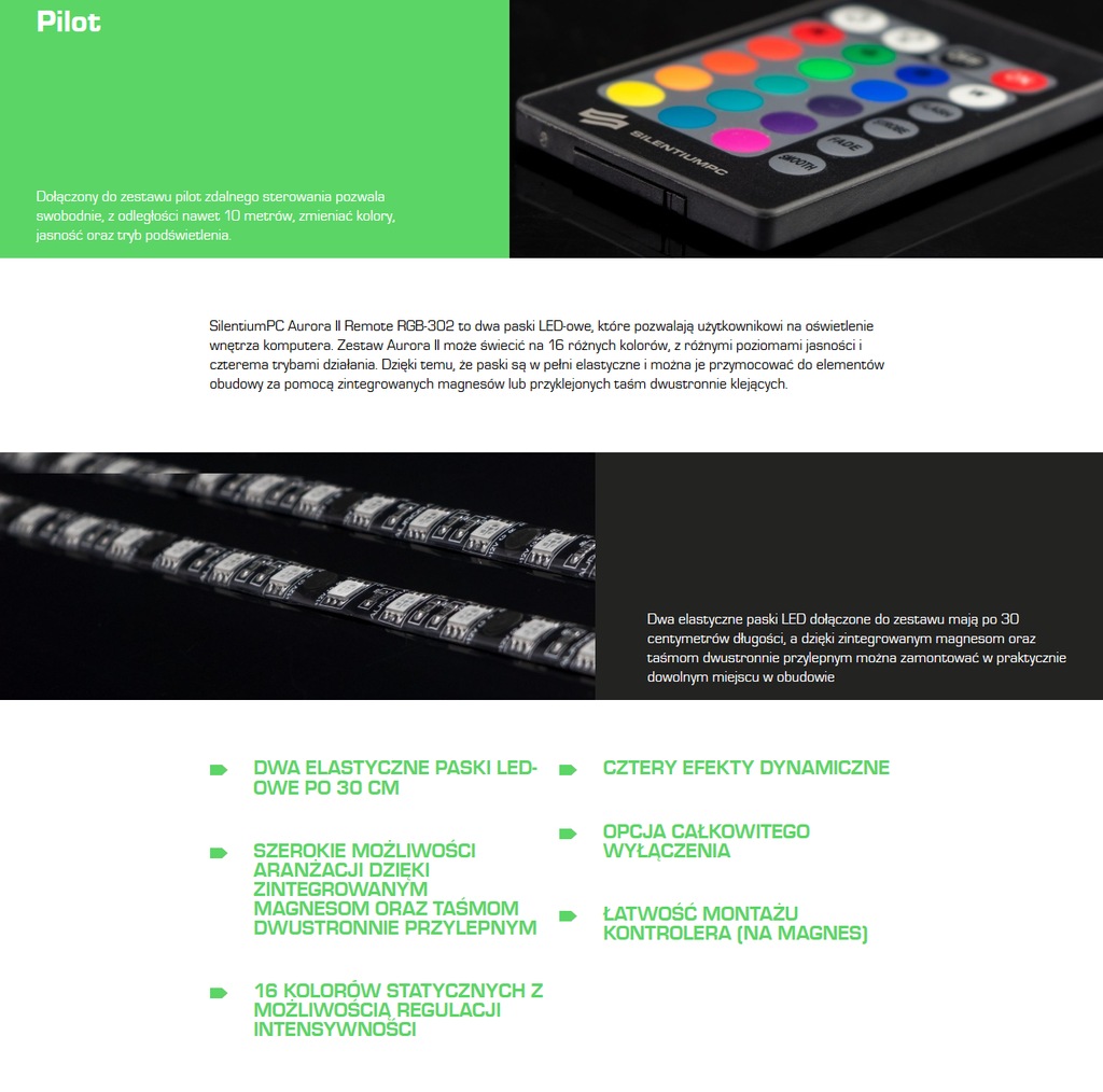 SilentiumPC Aurora II Remote RGB-302 to dwa paski LED-owe, które pozwalają użytkownikowi na oświetlenie wnętrza komputera. Zestaw Aurora II może świecić na 16 różnych kolorów, a użytkownik ma możliwość szerokiej aranżacji dzięki temu, że paski są w pełni elastyczne i można je przymocować do elementów obudowy za pomocą zintegrowanych magnesów lub przyklejonych taśm dwustronnie klejących.