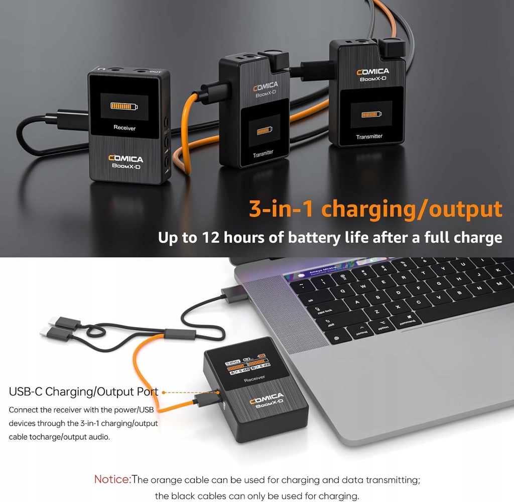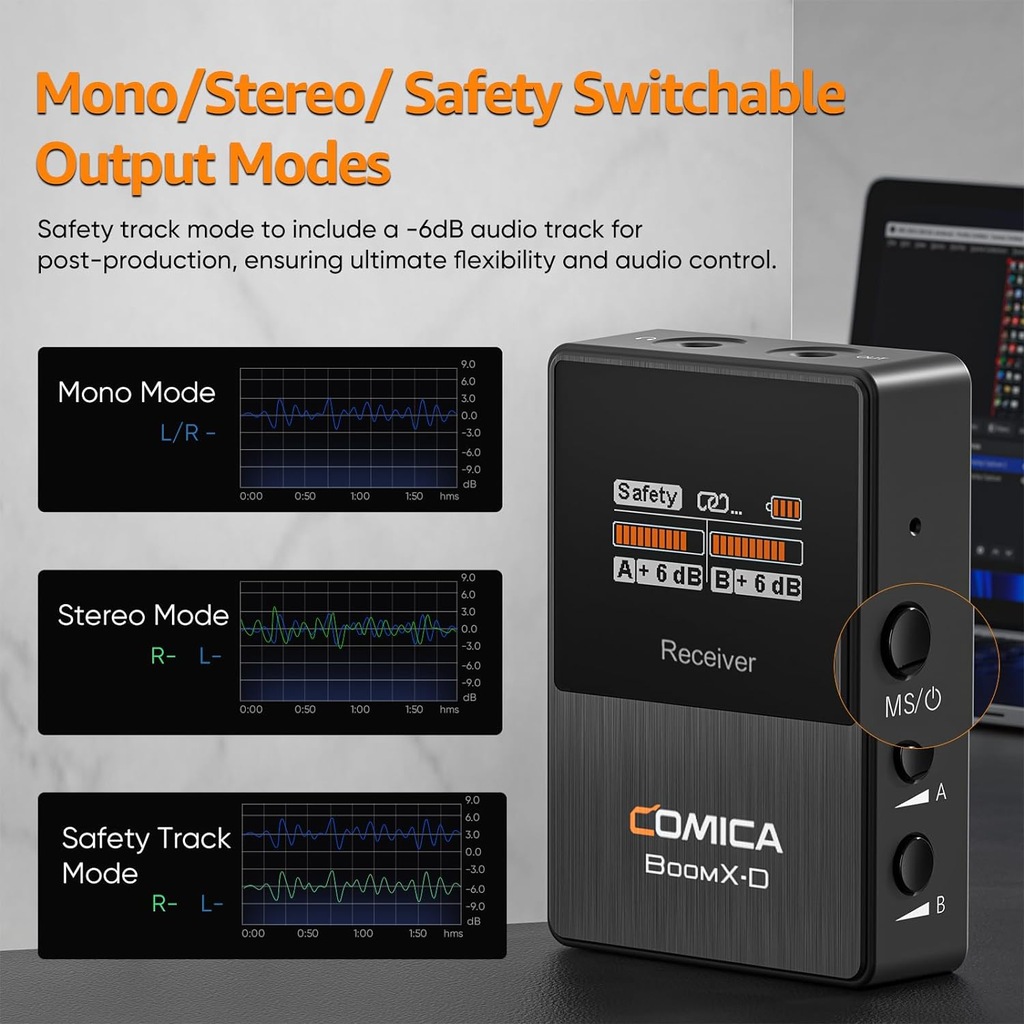 Bezprzewodowy mikrofon klapowy comica BoomX-D2 jest wyposażony w dwa nadajniki i jeden odbiornik. Z metalową obudową dla doskonałego ekranowania. Ma świetny sygnał i odbiera dźwięk bez innych dźwięków. Wyposażony w otwór na monitor słuchawek 3,5 mm, możesz sprawdzić, czy działa normalnie podczas nagrywania.