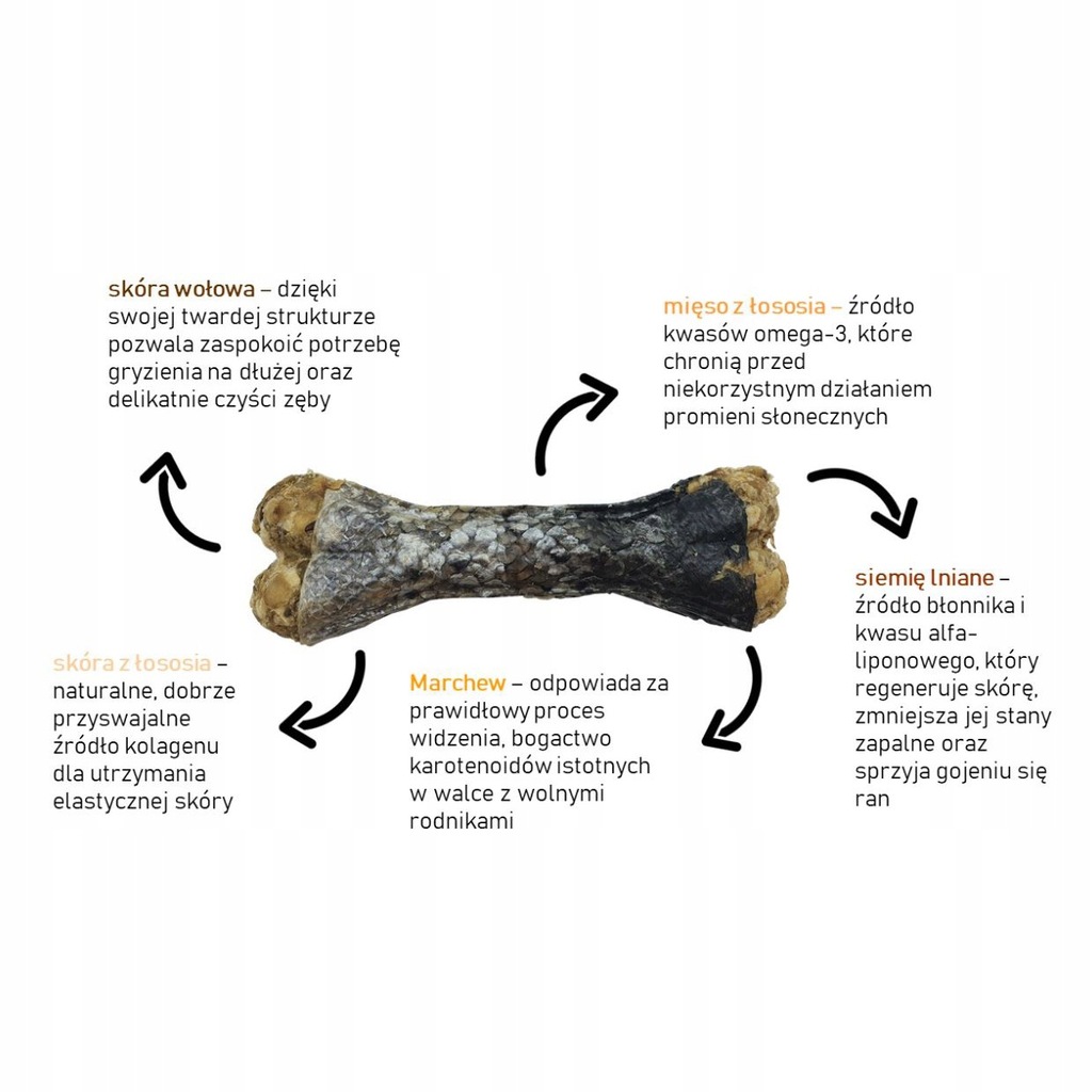 - Skóra wołowa w kościach jest w 100% naturalna, niebarwiona, poddawana jedynie 3 tygodniowemu procesowi suszenia w niskiej temperaturze (między 25℃ a 28℃). Suszenie w takiej temperaturze pozwala na zachowanie cennych właściwości odżywczych wszystkich komponentów