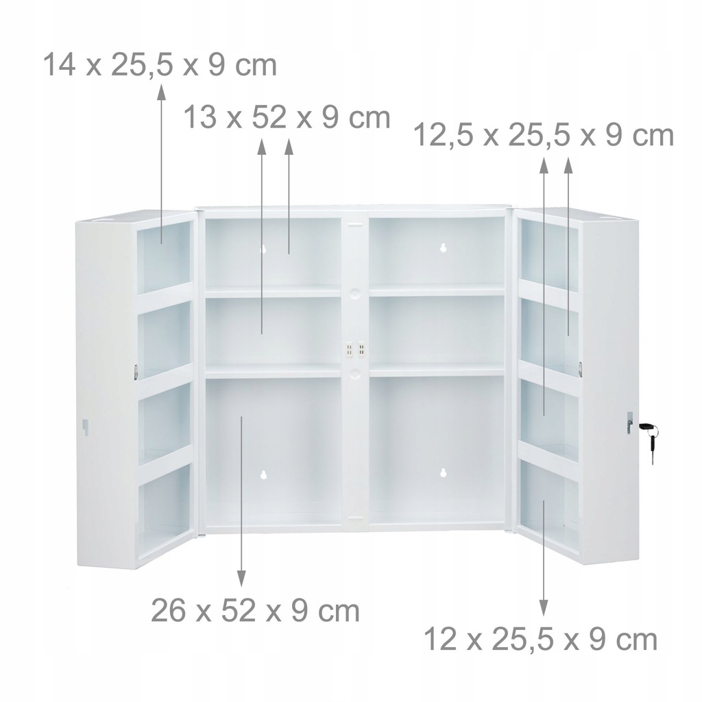 - Miejsce do przechowywania: 2-drzwiowa szafka na leki z 11 przegródkami na leki, materiały opatrunkowe i wiele innych.