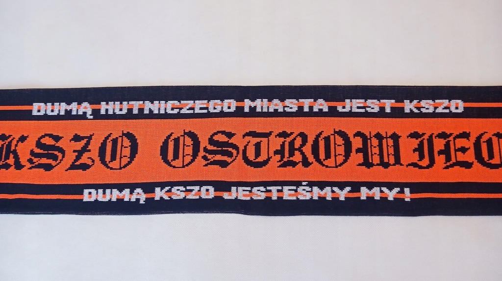 Dwustronny szal w klubowych barwach KSZO Ostrowiec.Napis na szaliku--DUMĄ HUTNICZEGO MIASTA JEST KSZO--DUMĄ KSZO JESTEŚMY MY! Na końcach czarne frędzle.