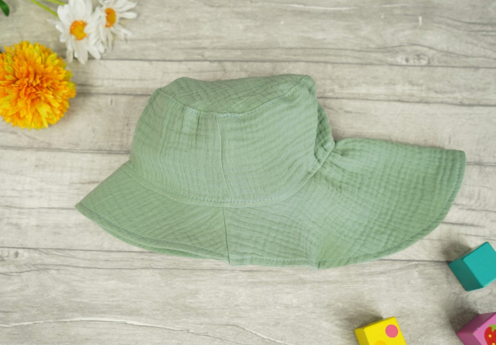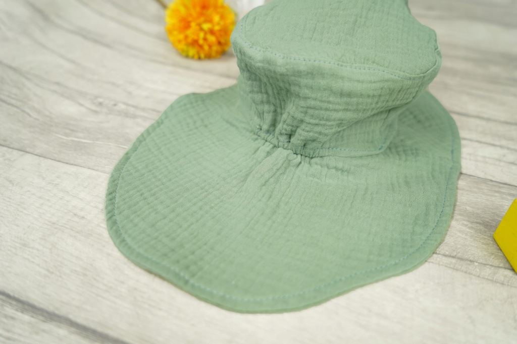 Letni kapelusz muślinowy w kolorze szałwiowej zieleni z przedłużonym tyłem osłaniającym kark.