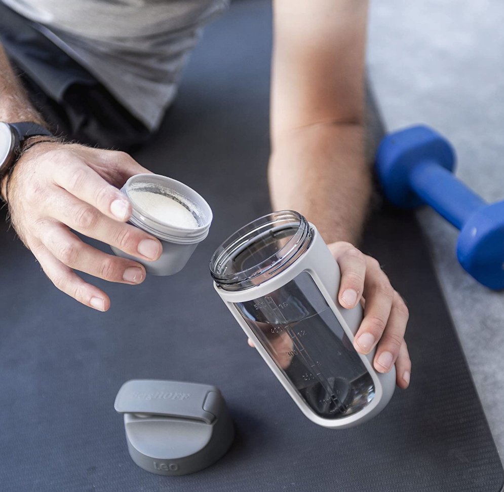 - Zintegrowany pojemnik wewnątrz shakera, pozwala na wsypanie białka lub suplementów, nie potrzebujesz brać ze sobą kolejnych opakowań. - wszystko w jednym miejscu