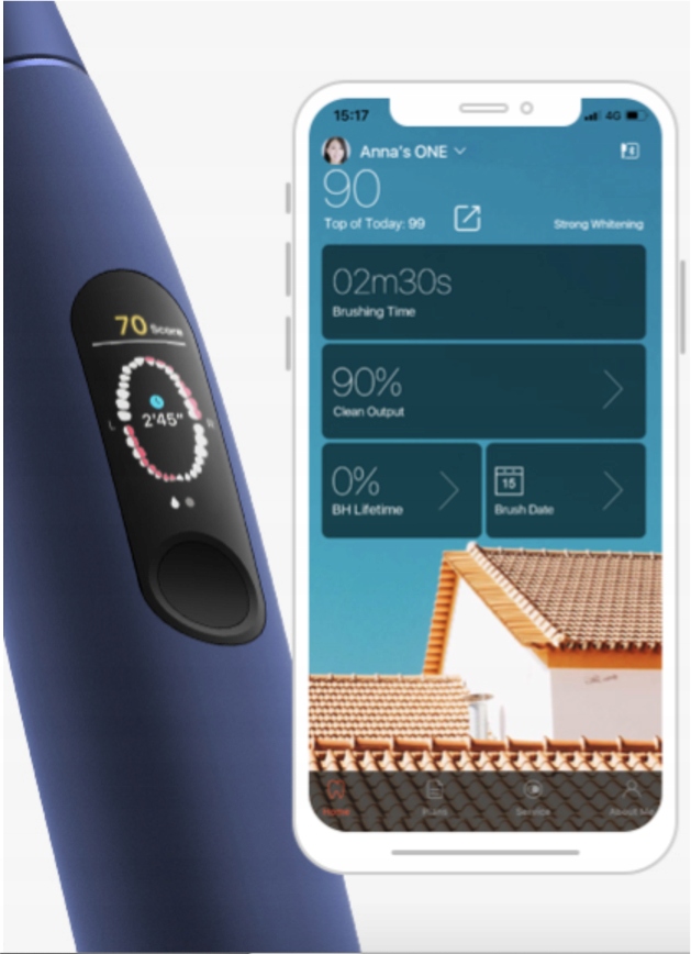 Szczoteczka soniczna zasilana sztuczną inteligencją, z kolorowym wyświetlaczem i aplikacją.