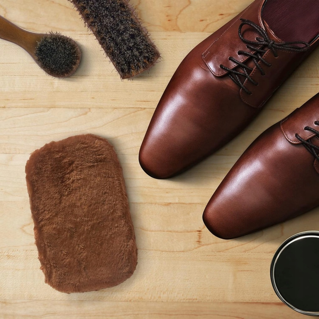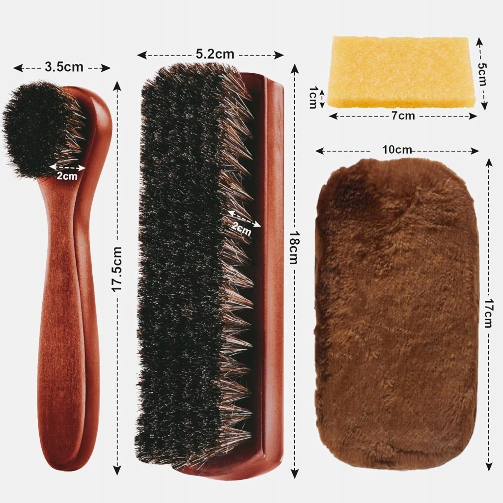 Zestaw zawiera cztery narzędzia: szczotkę okrągłą, dużą szczotkę z długim uchwytem, rękawicę do polerowania (kolor losowy) oraz gumowy czyścik. To kompleksowe rozwiązanie do pielęgnacji skórzanych butów i akcesoriów.