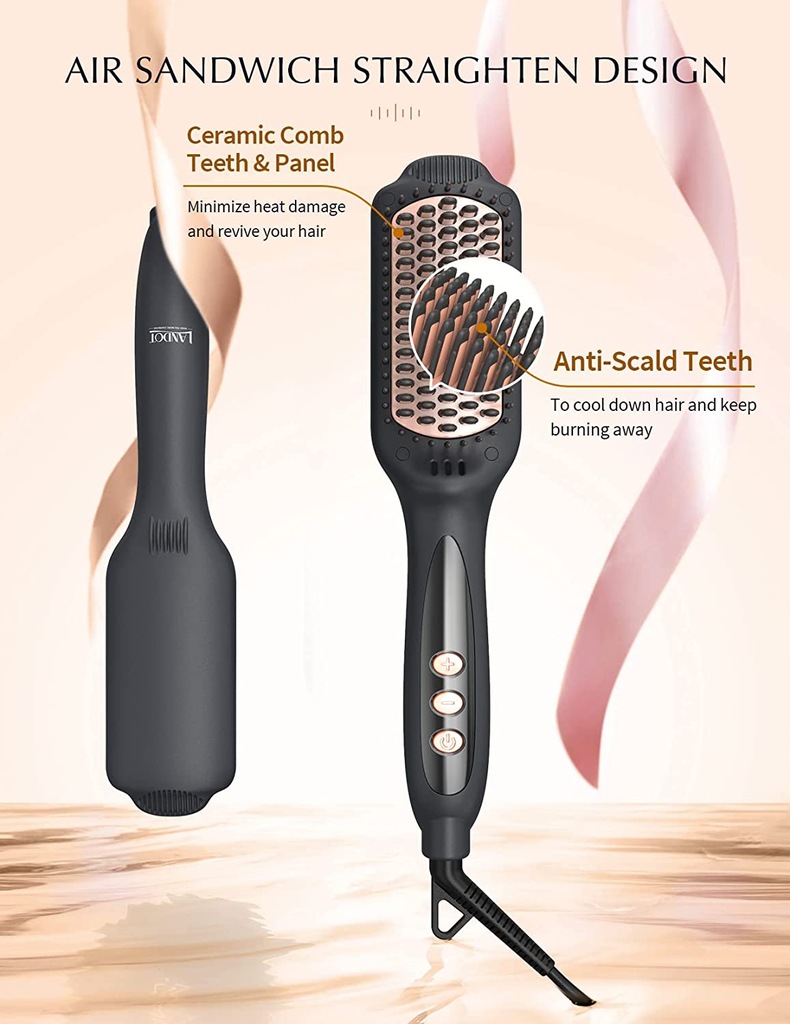 - Delikatna dla włosów szczotka do prostowania włosów z jonowaniem, zmniejsza ładunek elektrostatyczny włosów. Również dzięki wysokiej jakości komponentom ceramicznym, które są szczególnie delikatne dla włosów, nadaje włosom jedwabisty, lśniący, gładki wygląd