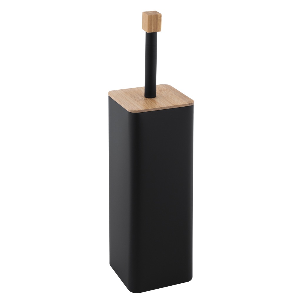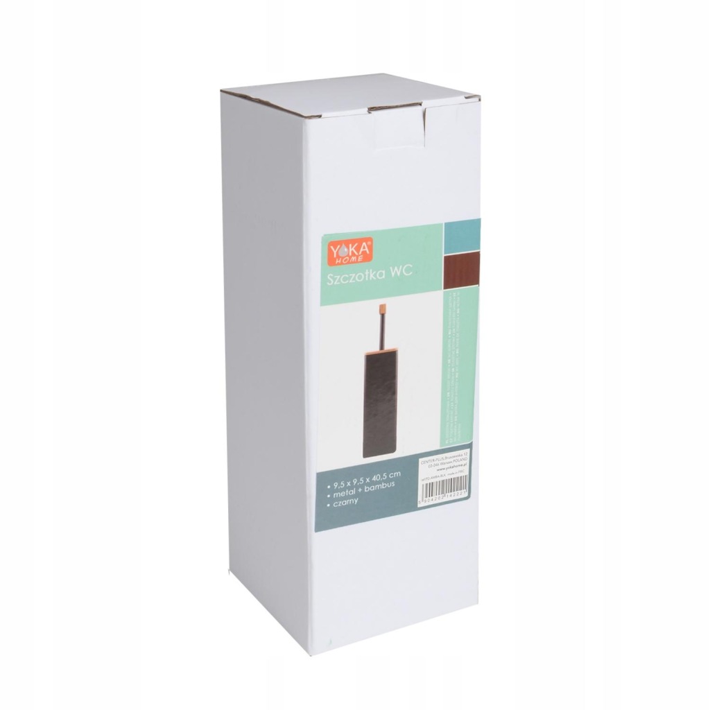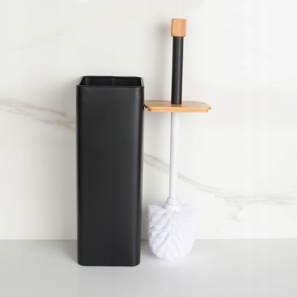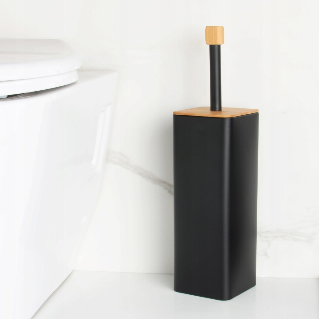 Praktyczna szczotka do WC z elementami z naturalnego drewna bambusowego. Szczotka WC wykonana została z wysokiej jakości stali malowanej na czarno (mat). Górna część szczotki WC i pokrywa ozdobiona została elementem wykonanymi z naturalnego drewna bambusowego odpornego na wilgoć. Wewnątrz pojemnika na szczotkę znajduje się osłonka / mniejszy wyjmowalny pojemnik na ociekającą wodę, dzięki czemu pojemnik na szczotkę jest suchy i czysty wewnątrz.