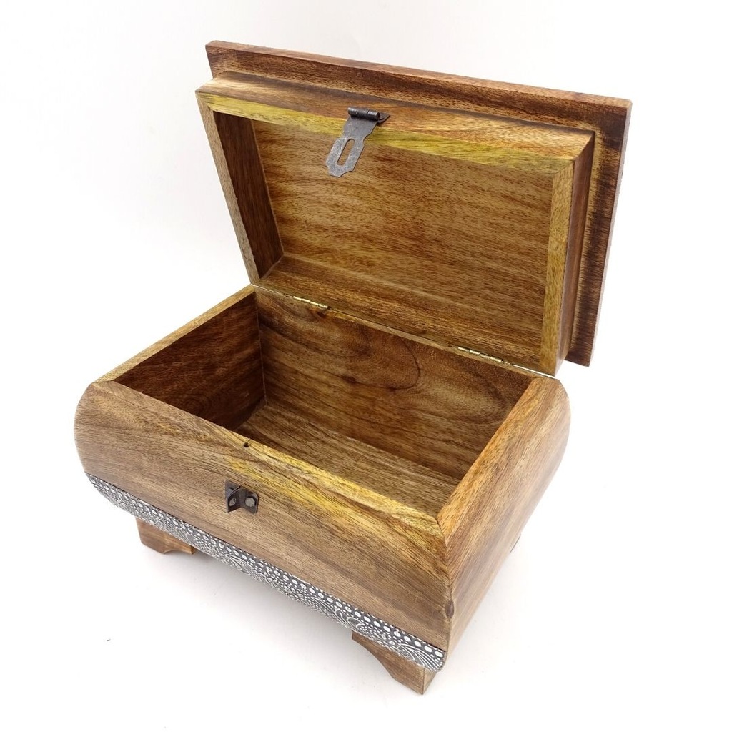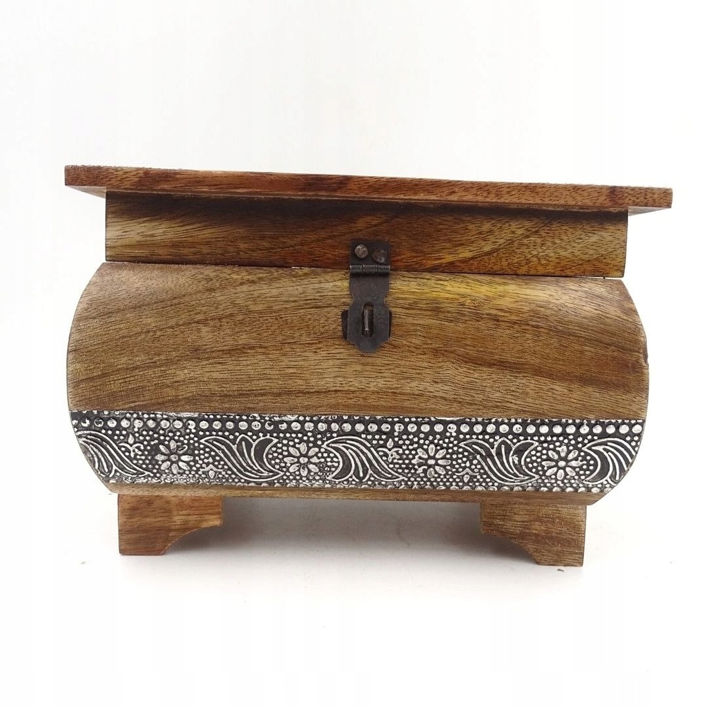 Szkatułka Drewniana Ozdobna – SE25 Szkatułka Drewniana Ozdobna ułatwia przechowywanie biżuterii i małych przedmiotów w elegancki sposób Niewielka szkatułka stworzona jest z drewna i ozdobiona metalowymi ornamentami Zamknięcie funkcjonuje jak w starych skrzyniach opierając się na wrzeciądzu i skoblu Szkatułka: ·Materiał: drewno, metal ·Wymiary: 16,5 cm ·Kolor: brązowy, srebrny, metaliczny