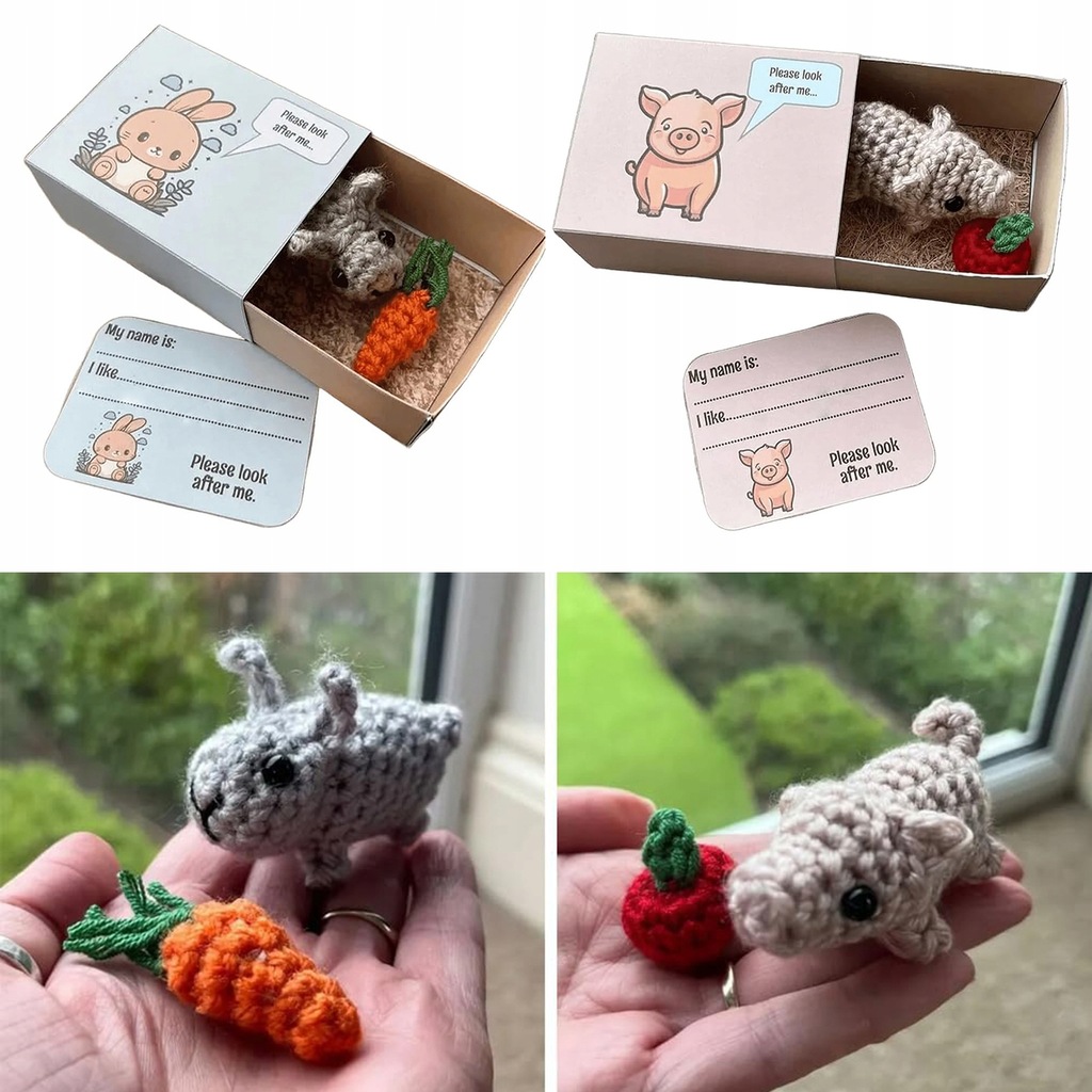 Bezszwowe pudełko zapałek: odkryj nasze szydełkowe zwierzaki z pudełka zapałek, dostępne w 9 uroczych stylach. Do każdego zwierzaka dołączone jest spersonalizowane pudełko i karta, na której można nazwać i wymienić ulubione potrawy. Dziel się miłością i optymizmem z tymi ujmującymi lalkami sentymentalnymi, które są idealnymi towarzyszami.