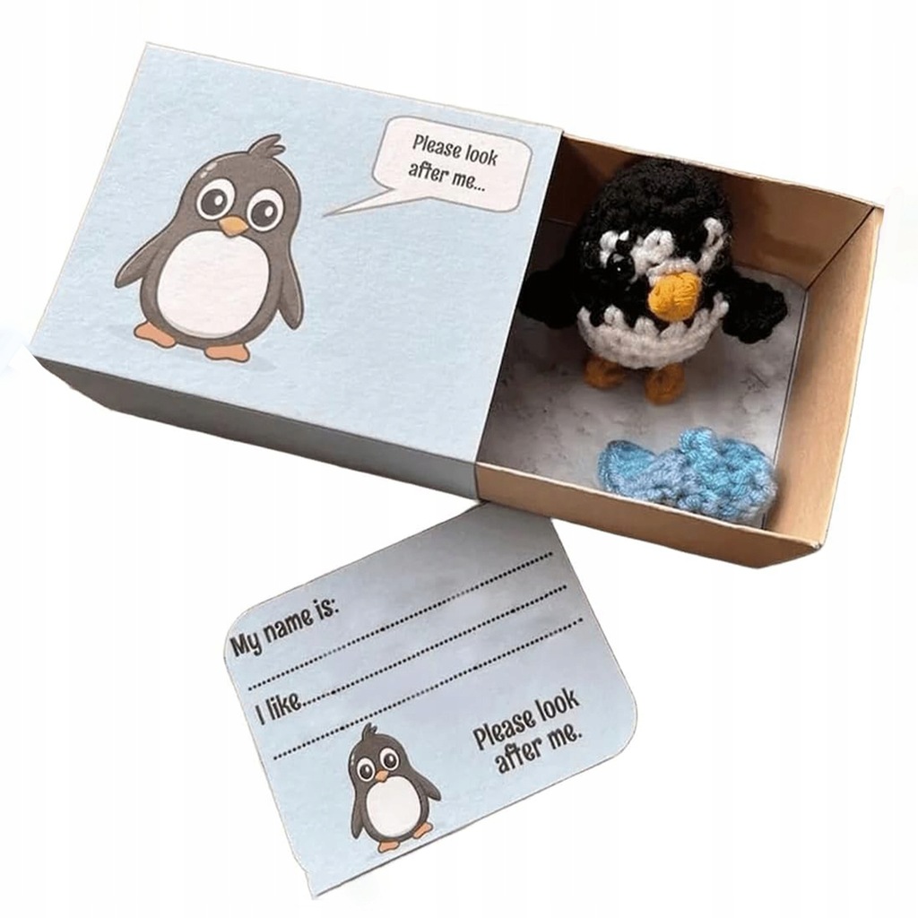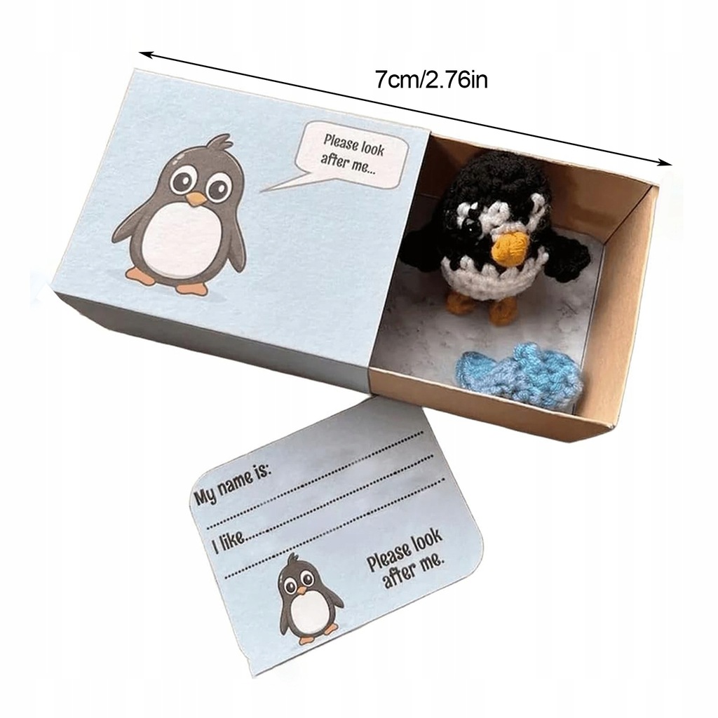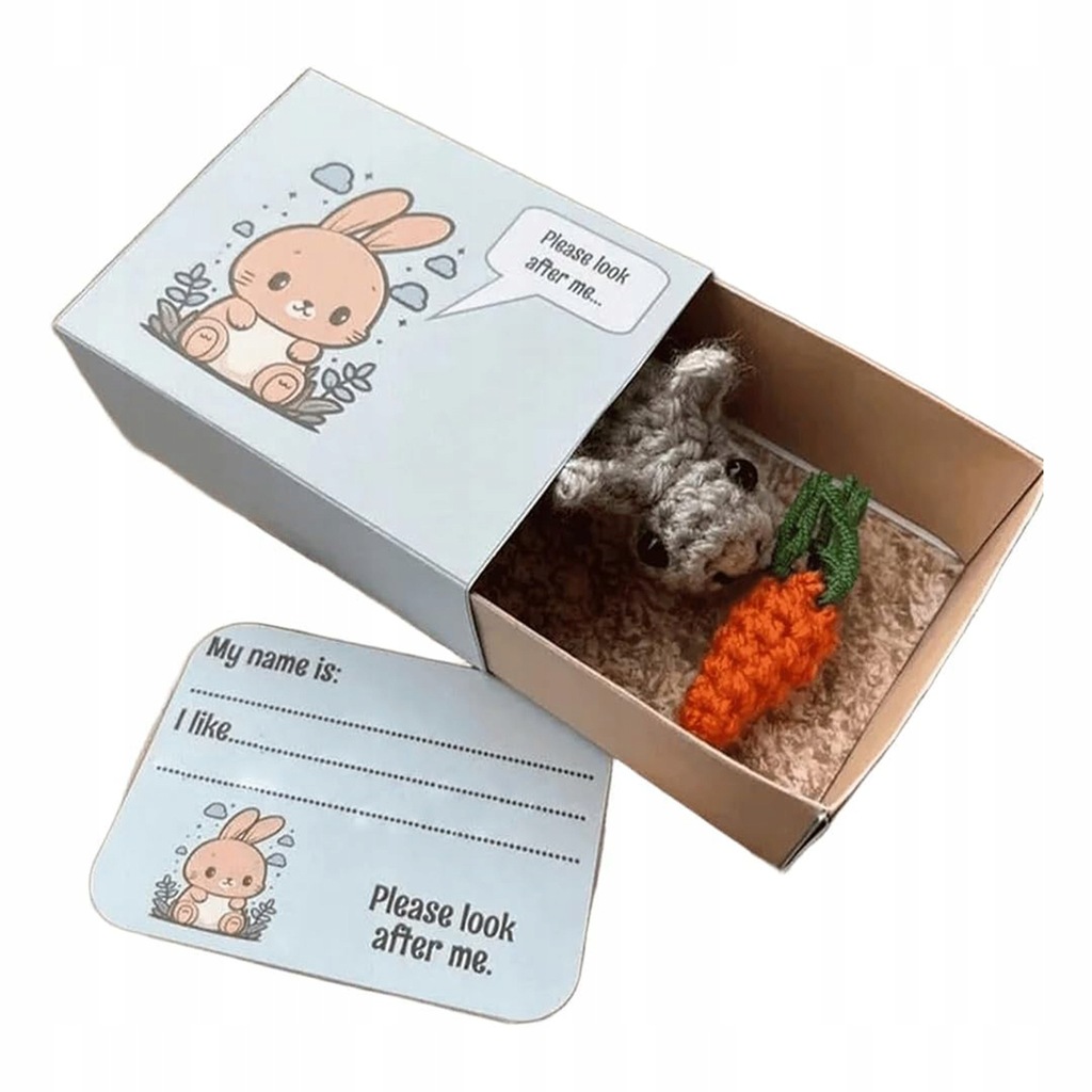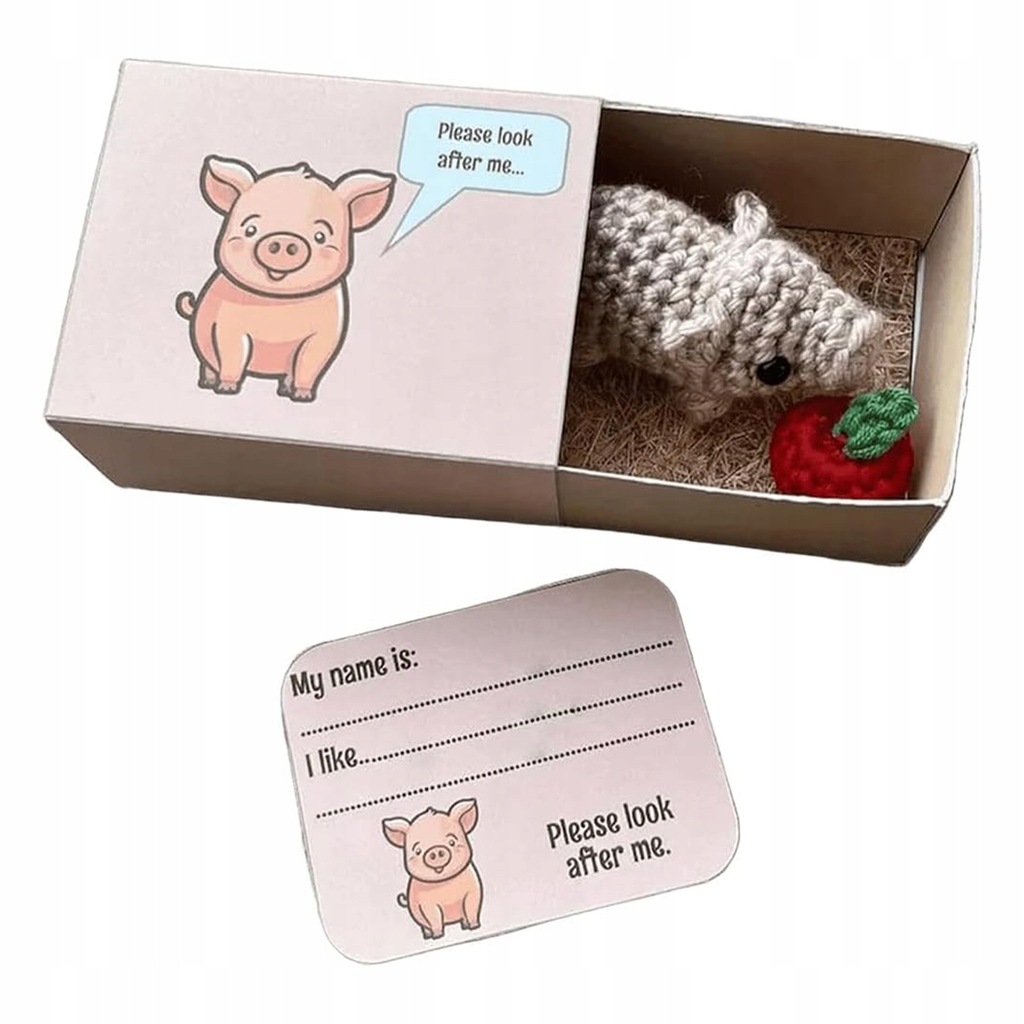 Bezszwowe szydełkowe zwierzątko w kształcie pudełka zapałek — wybierz spośród 9 zachwycających stylów szydełkowych zwierzątek w kształcie pudełka zapałek. Każde zwierzątko ma własne pudełko i kartę do personalizacji, dzięki czemu możesz nazwać swojego szydełkowanego towarzysza i wymienić jego ulubione potrawy. Dziel się miłością i optymizmem z tymi ujmującymi lalkami sentymentalnymi.