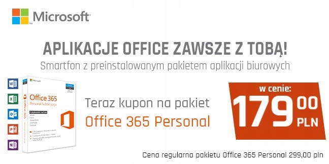Teraz oprócz preinstalowanych aplikacji w smartfonie otrzymasz kupon rabatowy w kwocie 120 zł* na roczną subskrypcję OFFICE 365 Personal na komputer.Korzystaj niezależnie gdzie jesteś – mobilnie i desktopowo!