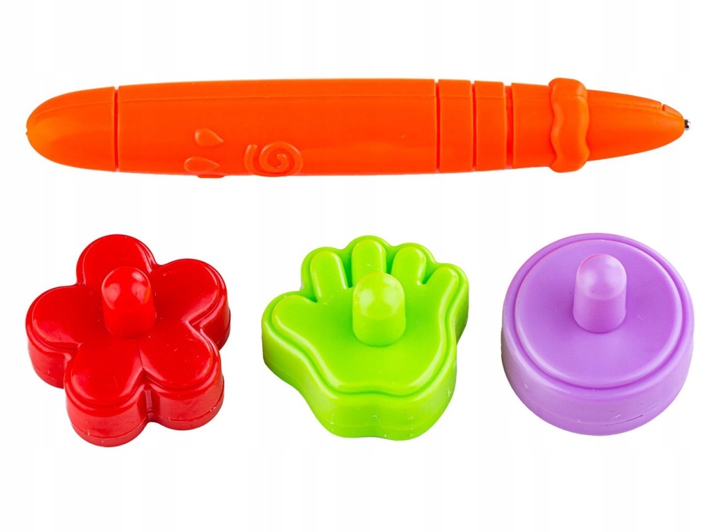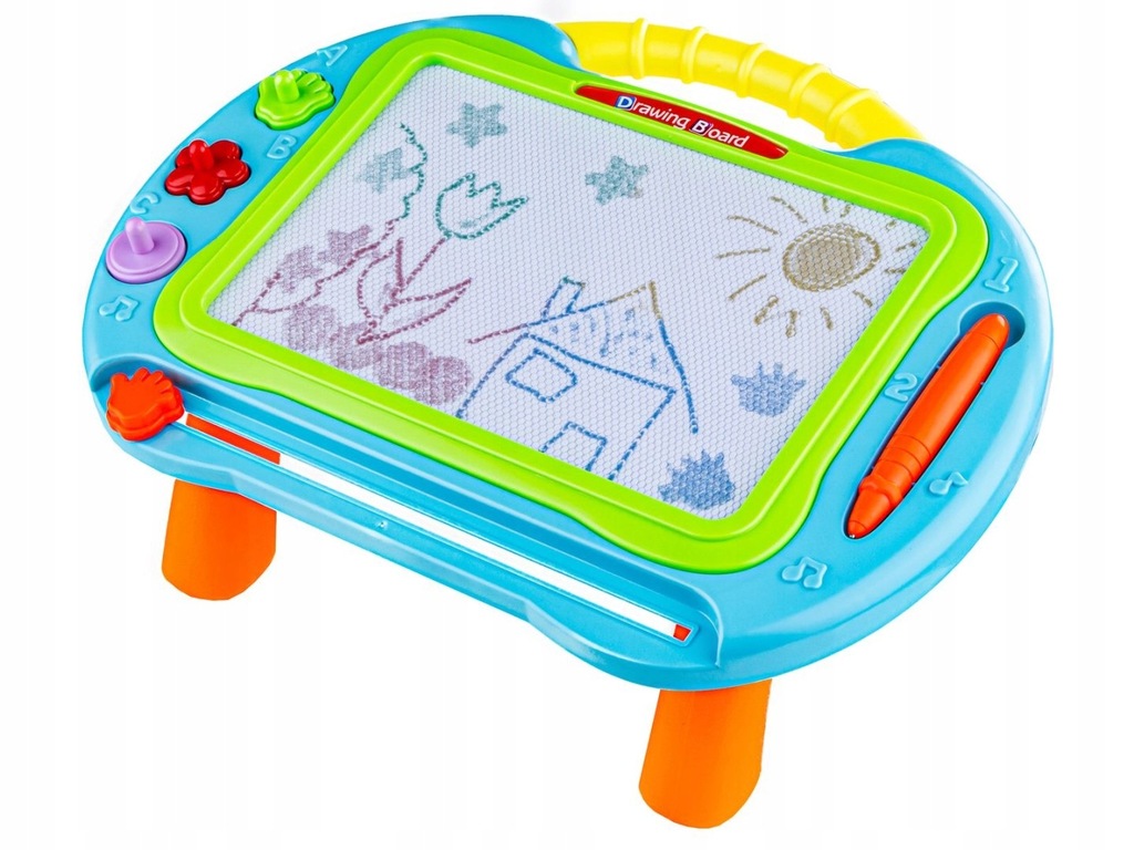 Dzięki naszemu zestawowi można tworzyć coraz to nowe obrazki a w razie potrzeby wszystko zmazać za pomocą jednego przesunięcia suwaka. Zestaw zawiera także 3 stempelki w kształcie koła, kwiatka oraz łapki. Tablica jest dzielona i w zależności od tego w jakiej części malujemy rysunek będzie miał on kolor zielony, czerwony, żółty oraz niebieski.