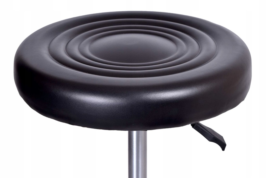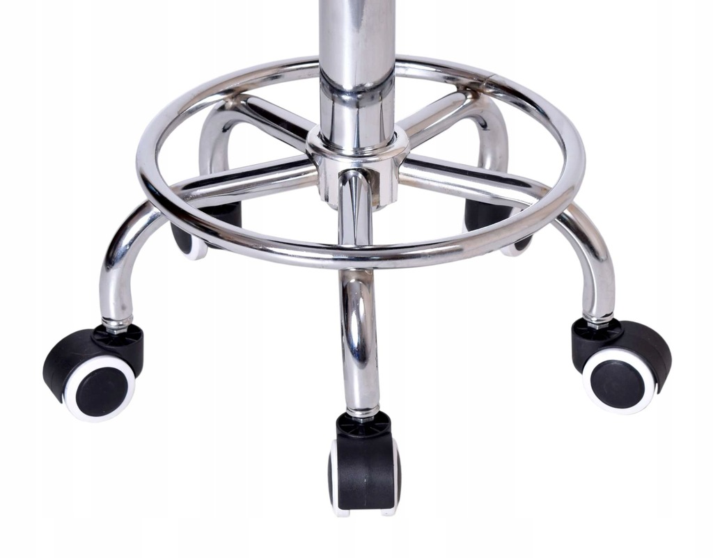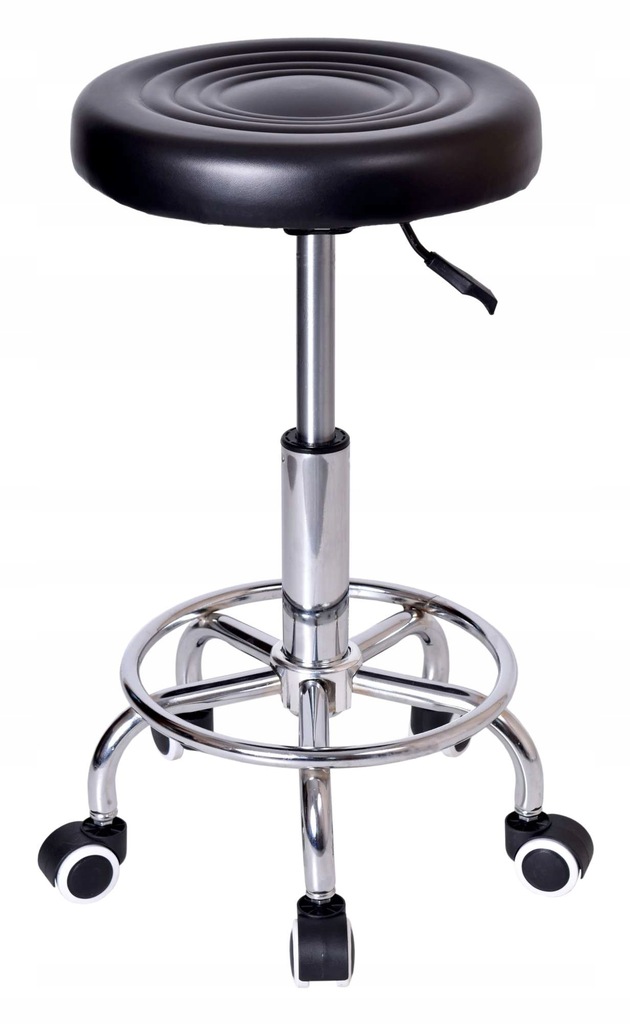 Klasyczny stołek kosmetyczny/fryzjerski. Posiada wygodne tapicerowane siedzisko z ekoskóry z regulowaną wysokością oraz stabilną podstawę na gumowych kółkach. Dzięki temu łatwo go przemieszczać.