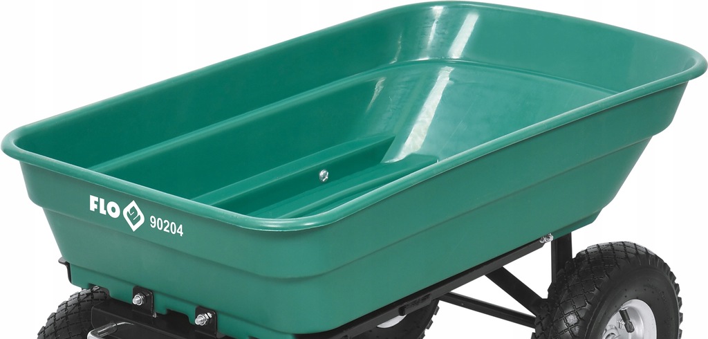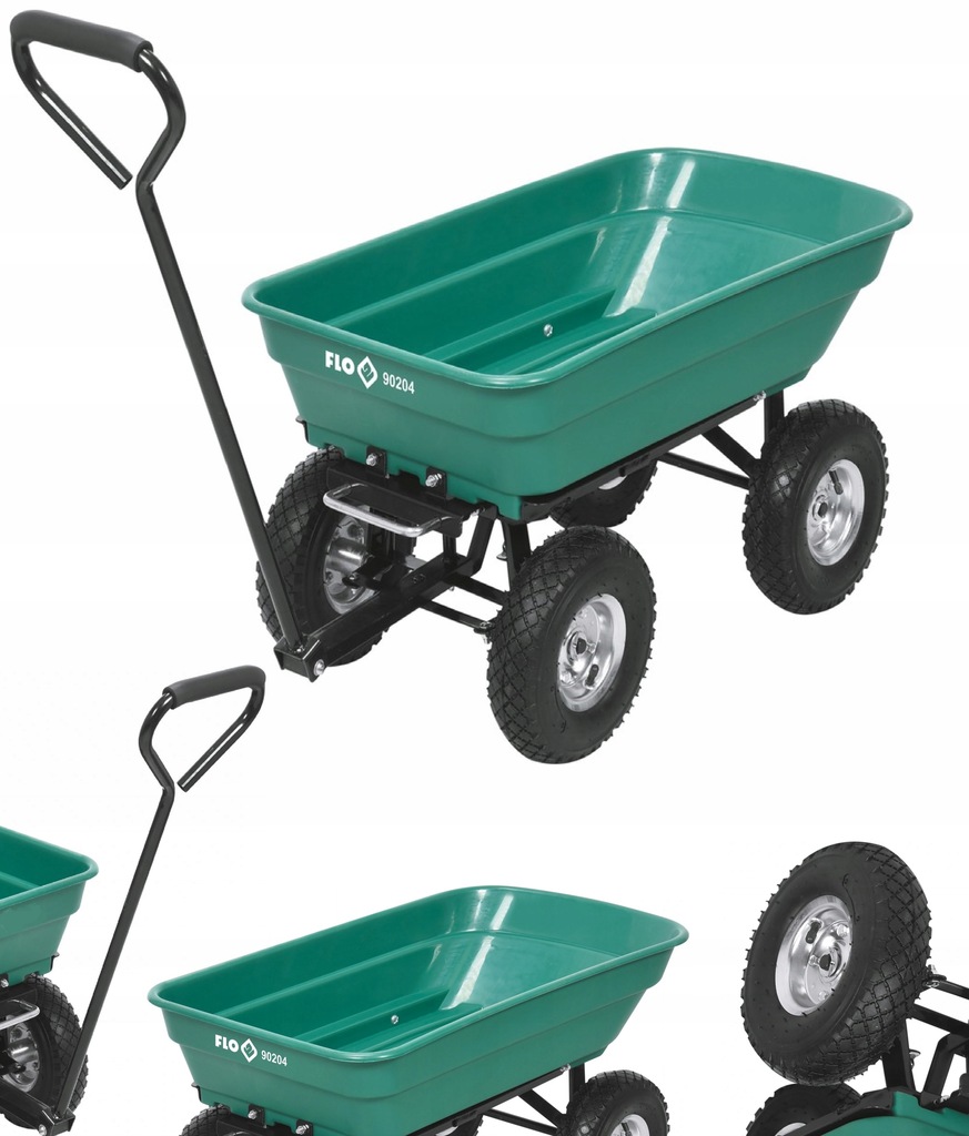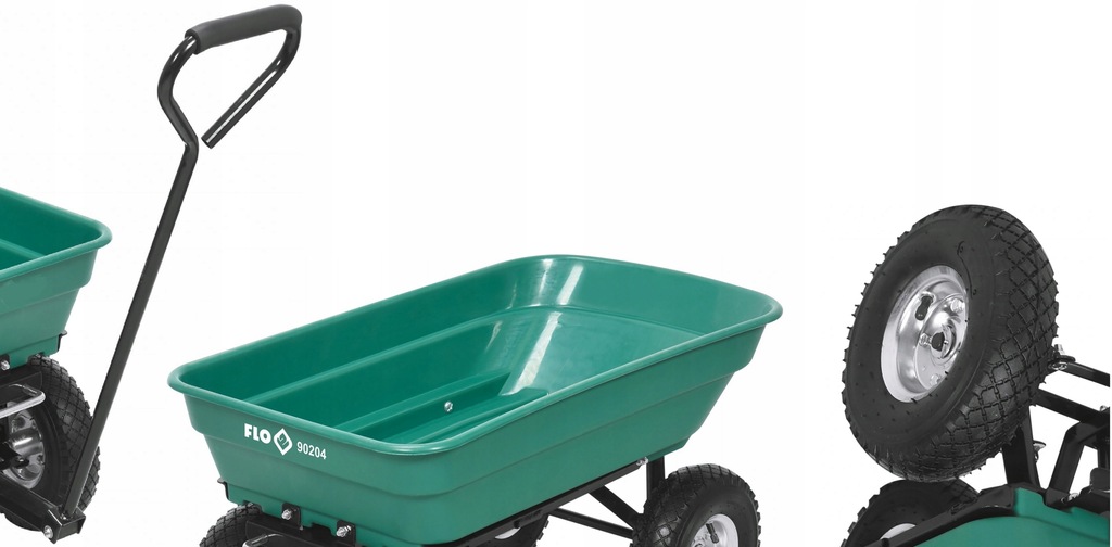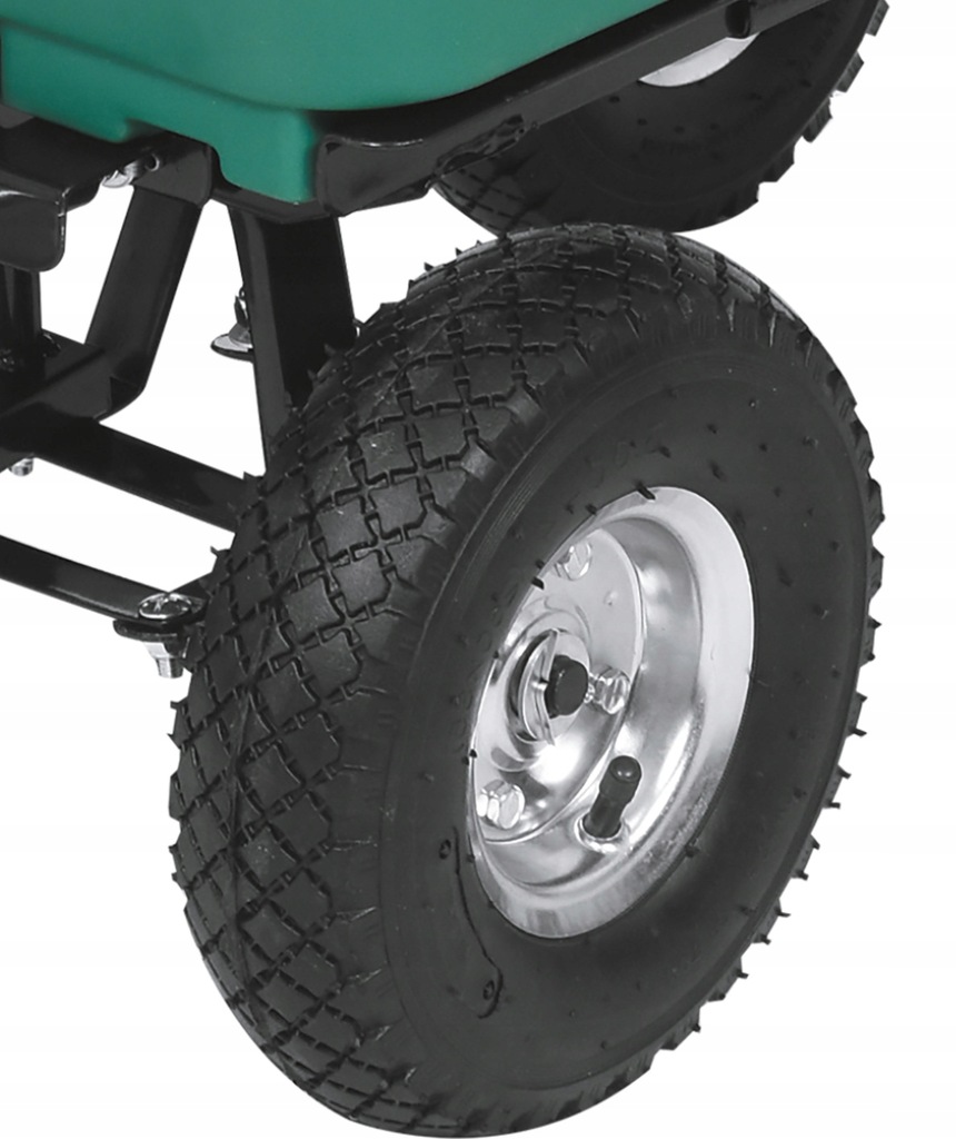 Wózek posiada 4 pompowane koła, kosz z PP i uchwyt do ciągnięcia. Przednia oś wózka jest skrętna.