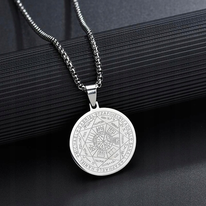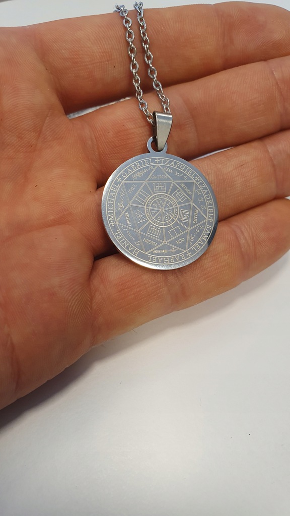 Pieczęć Siedmiu Archaniołów, nazywana także Talizmanem Siedmiu Aniołów, uznawana jest za jeden z najpotężniejszych ochronnych talizmanów świata. Na planie materii ma postać heksagramu (sześcioramiennej gwiazdy), w który wypisane są imiona siedmiu potężnych Archaniołów: Michała, Gabriela, Zafkiela, Rafaela, Zadkiela, Kamaela oraz Haniela. Realistyczne zdjęcia. Talizman jest z łańcuszkiem Realistyczne zdjęcia. Talizman jest z łańcuszkiem długość 60 cm. Średnica 3 cm.